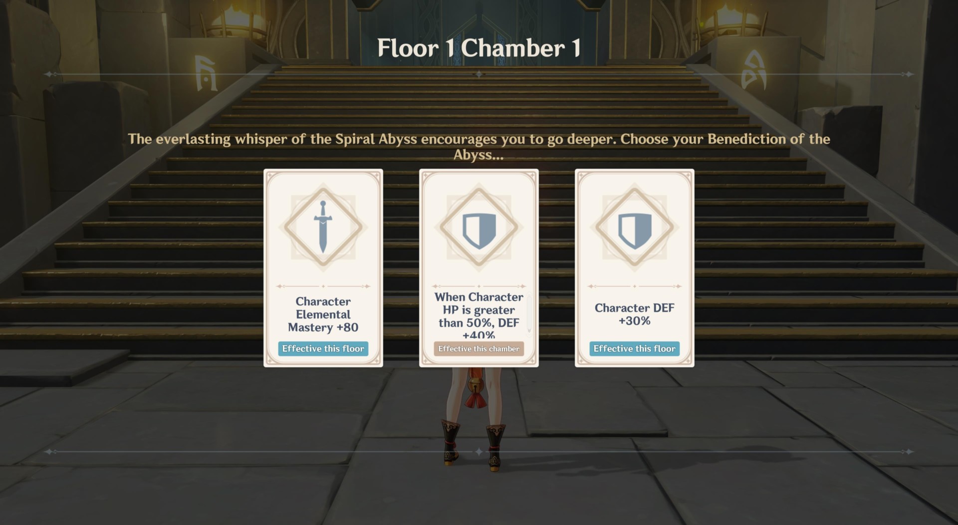 Your run will consist of going through the Spiral Abyss’ many floors, with each floor having three chambers. Each chamber you reach will also present you with a choice on which temporary blessing to pick up. Some last for one chamber/encounter, while others are active for the entire floor. Here are some examples: