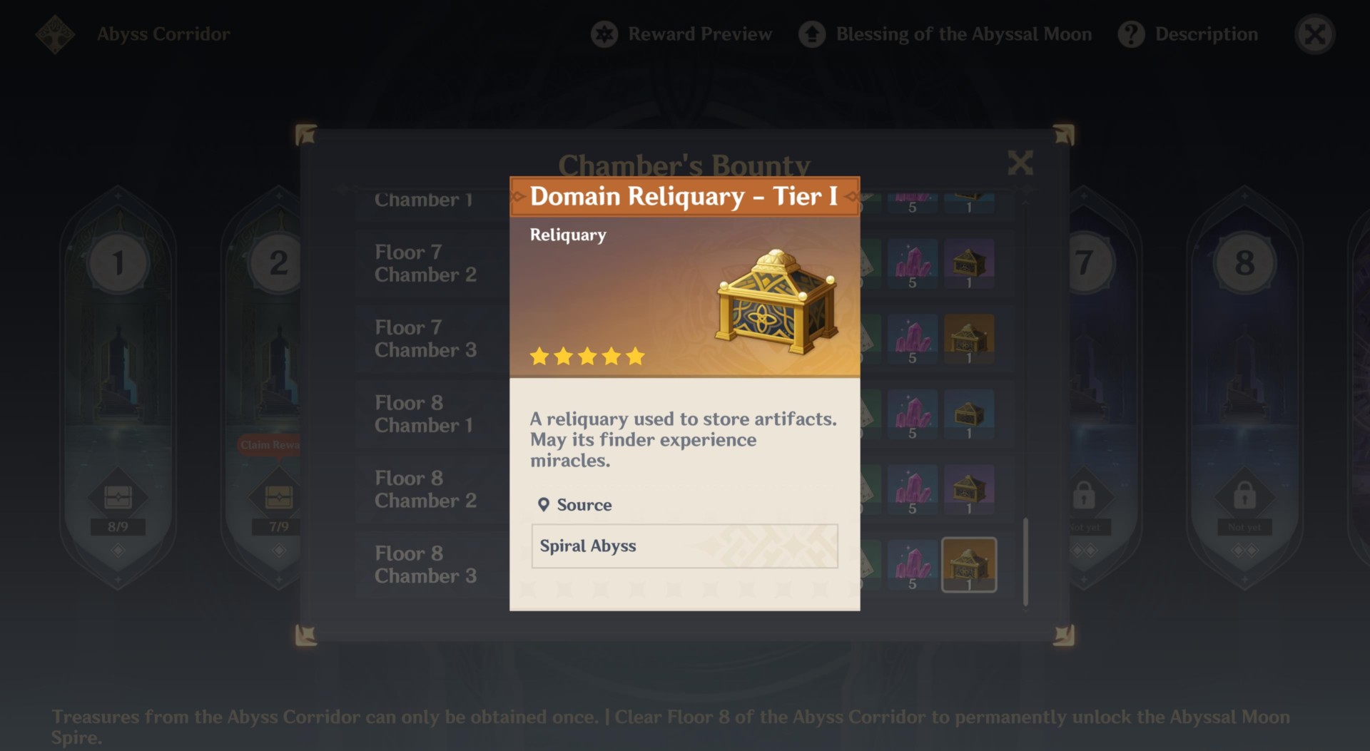 As mentioned earlier, the Spiral Abyss’ floors/chambers offer multiple rewards. If you click on the “Reward Preview” button, you’ll see all the rewards you can obtain just by clearing these chambers: