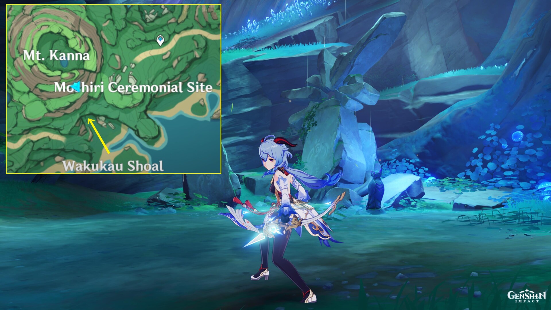 To reach Mount Kanna, you need to follow the pathway further to the south (near where you see the Wakukau Shoal label on the map). There’s an opening here that leads you to the base of the mountain.