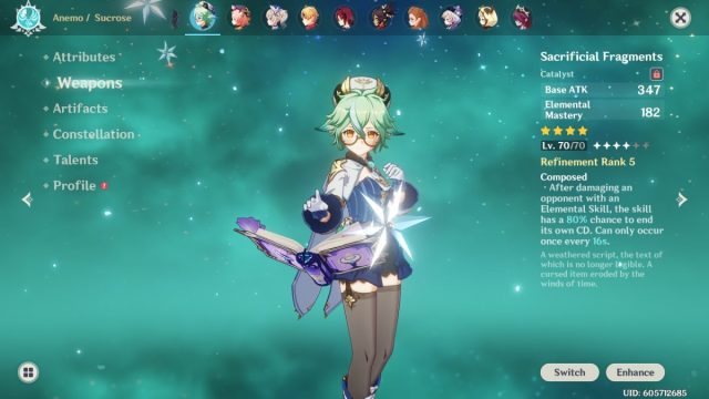 Favonius Codex – This is a weapon you use if you need to boost Sucrose’s Energy Recharge. The Favonius Codex also allows you to funnel some extra energy particles to your allies, giving it some extra utility on the side.