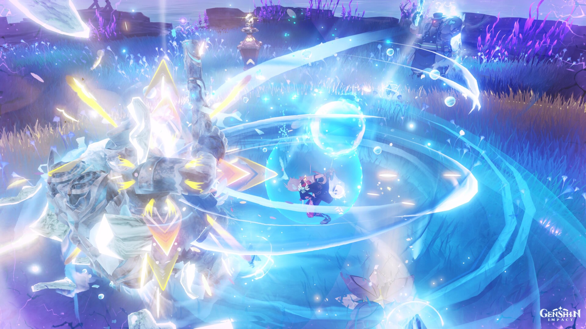 Xavier will plop down the Purification Device and you’ll need to defend it from six Fatui enemies. You’ll fight three opponents at first, then the next set will spawn (i.e., a Mirror Maiden and two Fatui Assassins). Mind you, aggroing them and using crowd control abilities are important since they can easily destroy the Purification Device if they get close to it.