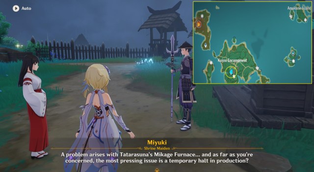 To get started with Genshin Impact‘s Tatara Tales quest, you’ll have to reach the Kujou Encampment area of Kannazuka. It’s directly west of the Violet Court domain. Once you’re there, look for the fast travel point. You’ll encounter two people arguing about the current situation.