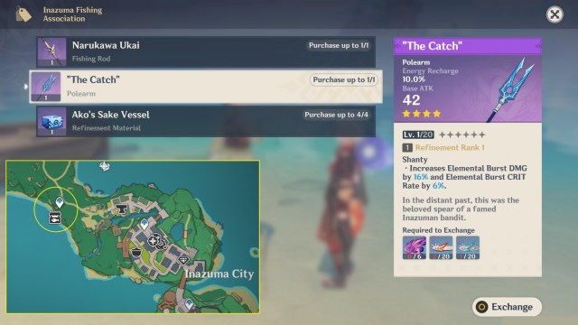 To get The Catch polearm in Genshin Impact, we’ll need to go to Inazuma City. Specifically, it’s the fast travel point just northeast of the city’s outskirts. Here, you’ll find a fishing vendor named Kujirai Momiji. She sells the following items: