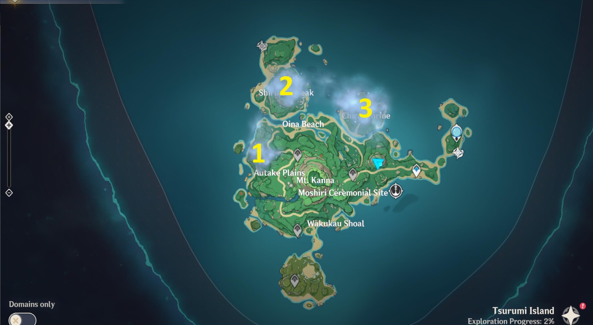 If you look at the world map, these locations are covered in mists. These are Autake Plains (west), Shirikoro Peak (northwest), and Chirai Shrine (northeast). We cover these in detail in separate guides.