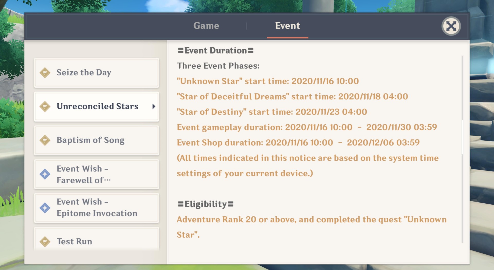 Note 1: To be clear, Genshin Impact‘s Unreconciled Stars event has three phases (Unknown Star, Star of Deceitful Dreams, and Star of Destiny). Only Unknown Star is available now (November 16). Meanwhile, Star of Deceitful Dreams goes live on November 18 at 4 a.m. Lastly, Star of Destiny goes live on November 23 at 4 a.m. These are based on your selected server and a specific timezone for that region.
