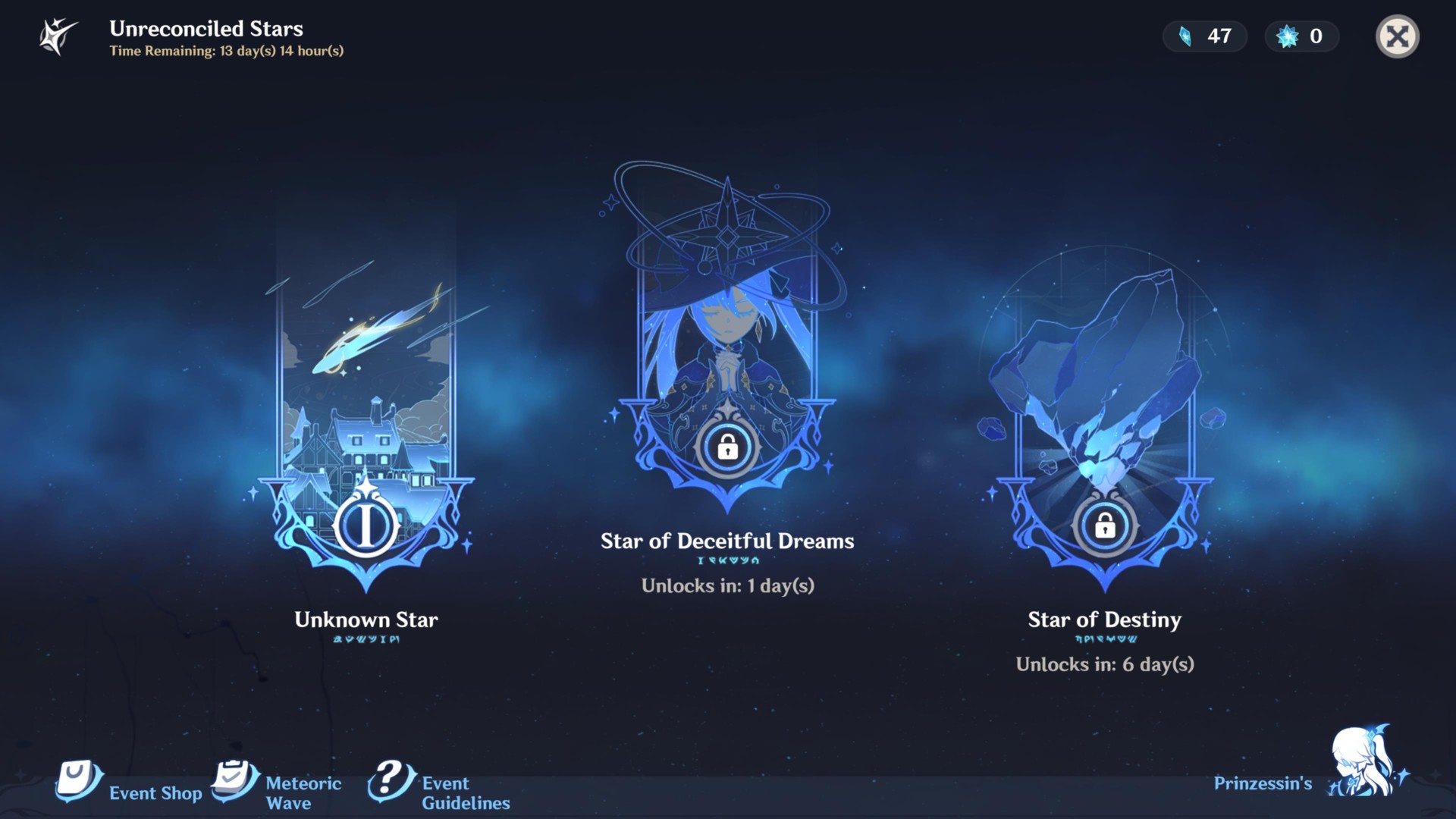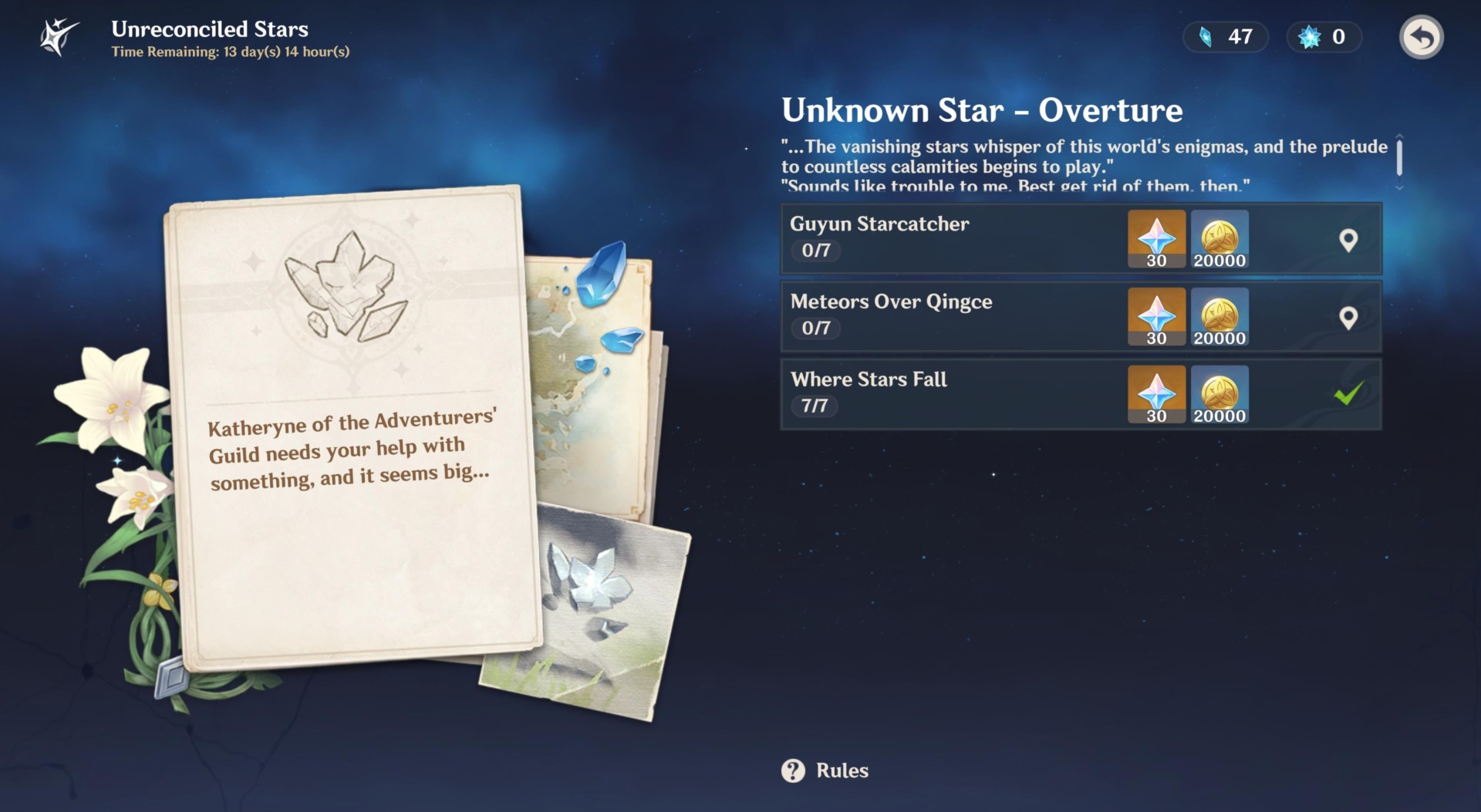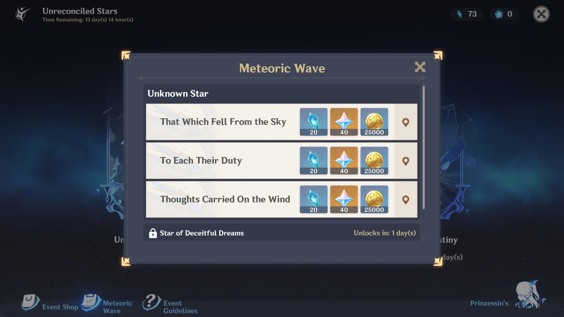 Likewise, take a look at the Meteoric Wave panel. This shows you three sidequests that you can complete for each part of Genshin Impact‘s Unreconciled Stars event.