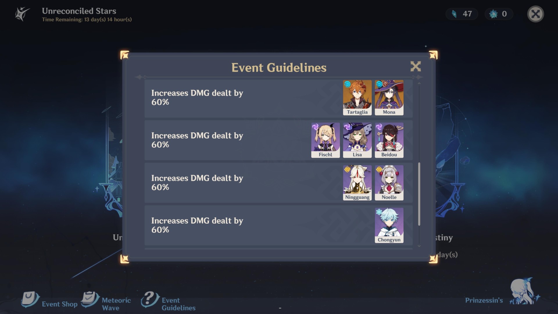 Meanwhile, if you check the event guidelines, you’ll see that several characters have gained +60% damage boosts while you’re doing event-related activities.