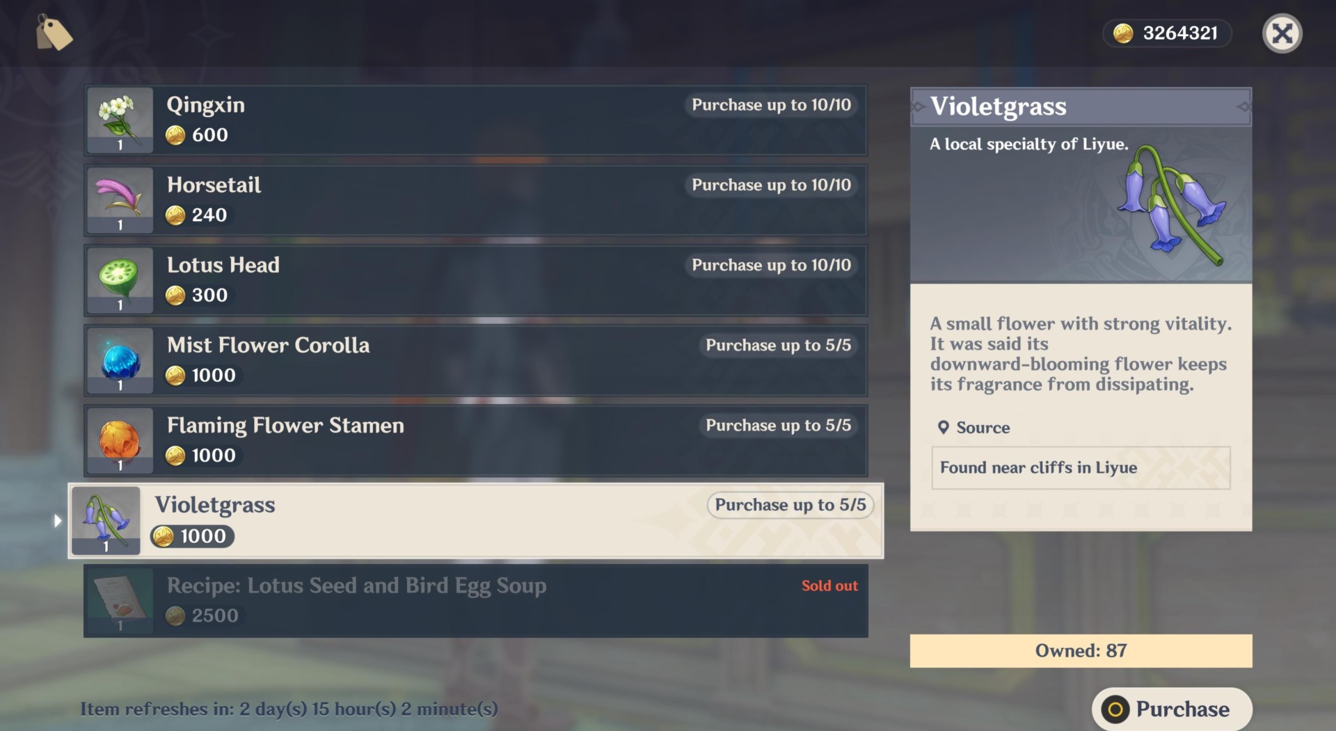 Head to the large building in Liyue Harbor where you originally met Qiqi. This is Bubu Pharmacy and the vendor here sells five Violetgrass every 48 hours in Genshin Impact.