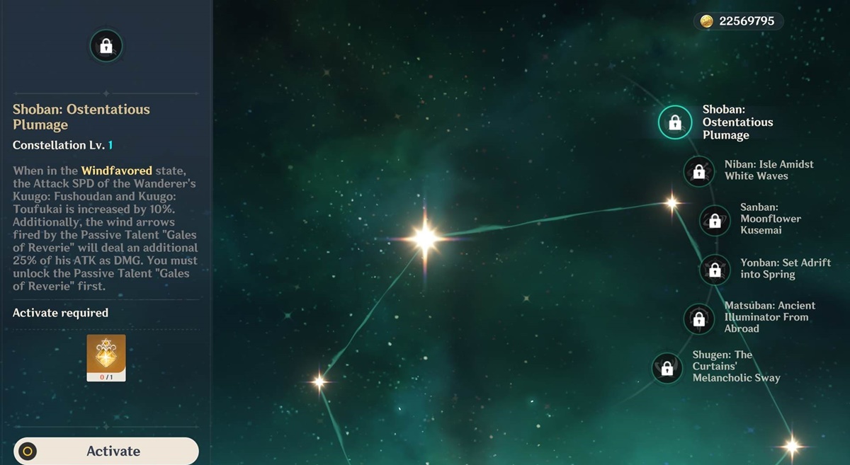 - C1: Shoban Ostentatious Plumage – +10% normal and charged attack speed. Anemo arrows from the Gales of Reverie passive gain 25% of ATK as damage.