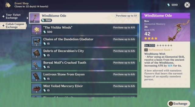 The Windblume Ode bow can be found in Genshin Impact’s Windblume Festival event shop. It costs 700 Peculiar Collab Coupons. Meanwhile, each piece of its unique refinement material, The Visible Winds, costs 500 Peculiar Collab Coupons.