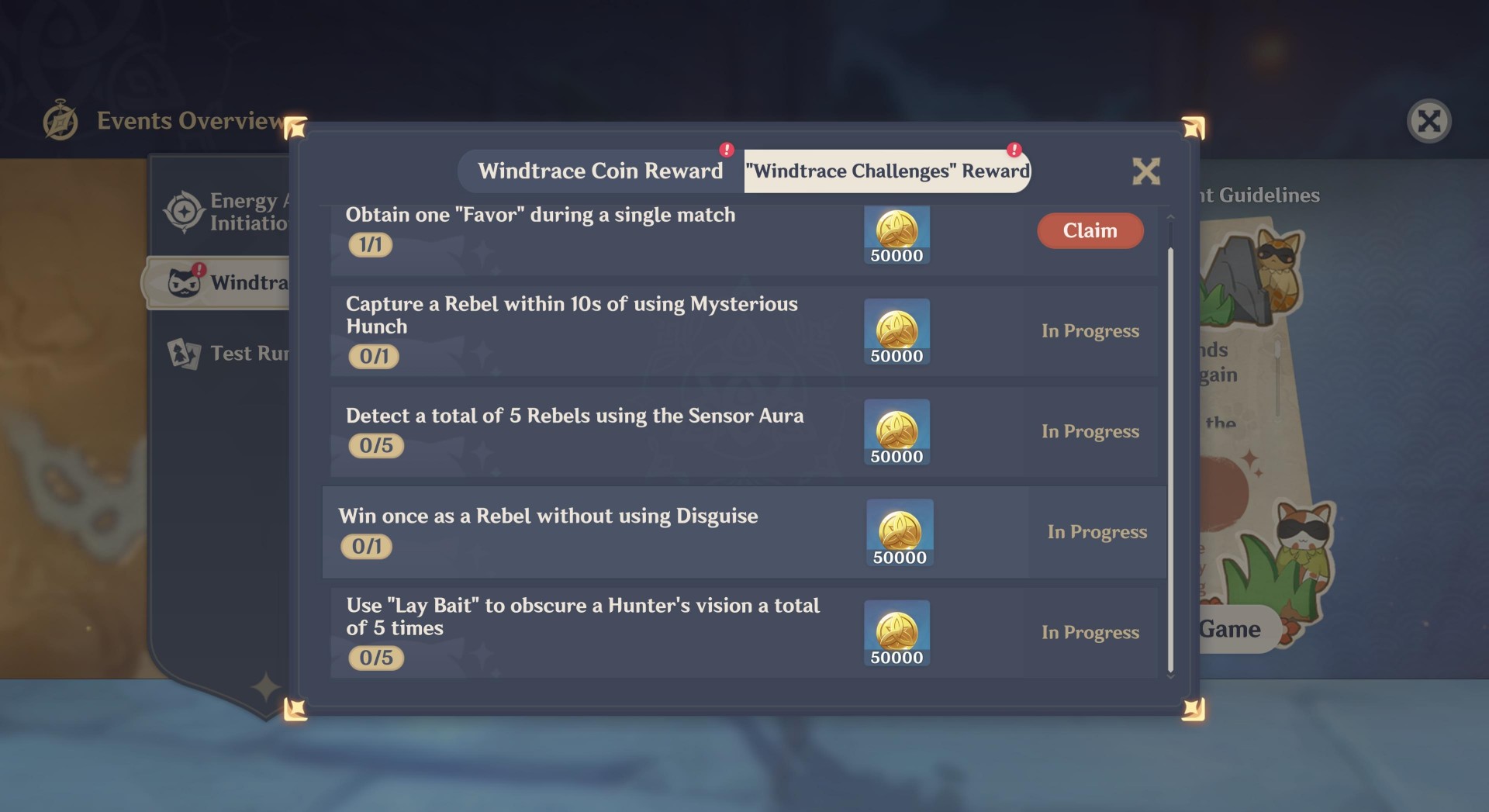 Note: For today, you can only hold up to 1,200 Windtrace Coins. Each succeeding day, this cap increases by 600. By the end of the event, you’ll want to have amassed 4,800 Windtrace Coins in total to receive the Peekaboo name card.