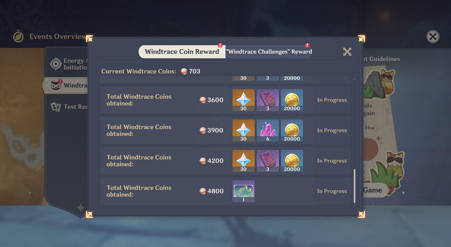 - Windtrace Coin reward – This has items like XP booklets, talent booklets, gold, and primogems. You’ll be able to grab these once you’ve reached a Windtrace Coin threshold (more on this concept in a while).
