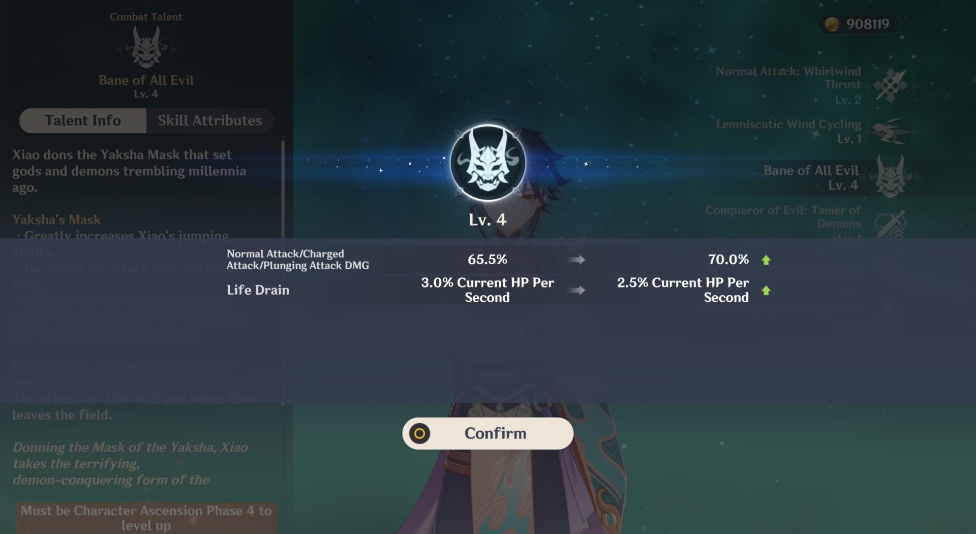 Note: Long story short, you’ll want to level-up Xiao’s “Bane of All Evil” followed by “Whirlwind Thrust” (since this also boosts plunging attack damage). Don’t bother with “Lemniscatic Wind Cycling” unless you have a lot of resources.