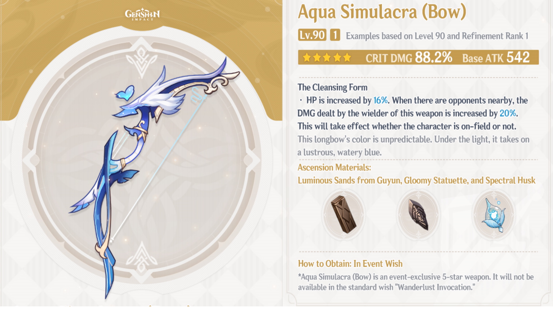 Aqua Simulacra (crit damage) – This 5-star bow is the best weapon for Yelan, as it is featured alongside her wish banner. It automatically increases her HP by +16%. Likewise, her damage is increased by 20% as long as there are enemies nearby. This effect will remain active even if she’s not on the field. Because Yelan’s playstyle requires her to be an off-field/sub-DPS, this will benefit the DPS from her Depth-Clarion Dice burst/Exquisite Throw dice turret.