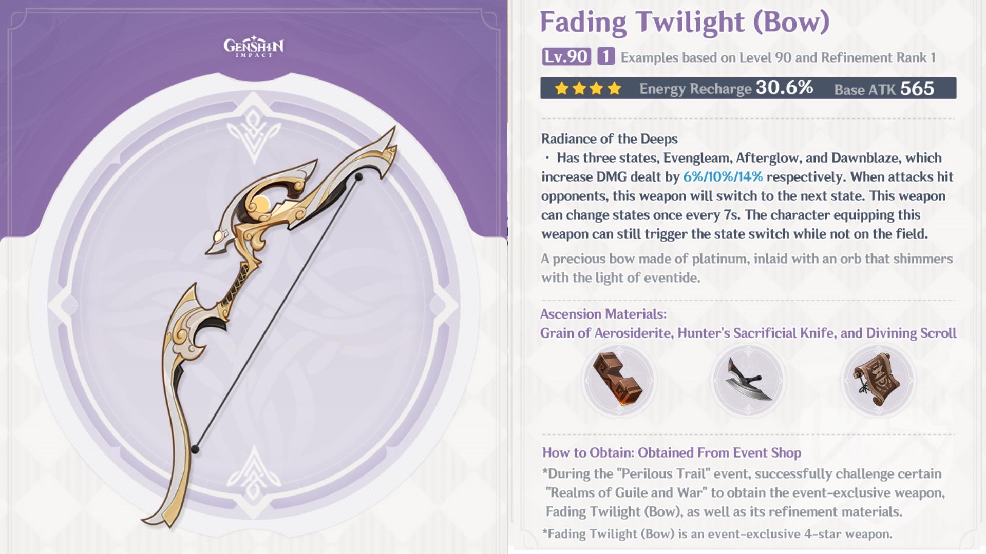 Fading Twilight (energy recharge) – This is also an energy recharge option. Thankfully, this weapon for Yelan is of the free-to-play variety from an upcoming event. Attacks that hit opponents (including skills and bursts) change the weapon’s state, with each state providing 6%/10%/14% damage. This can be triggered off-field, too.
