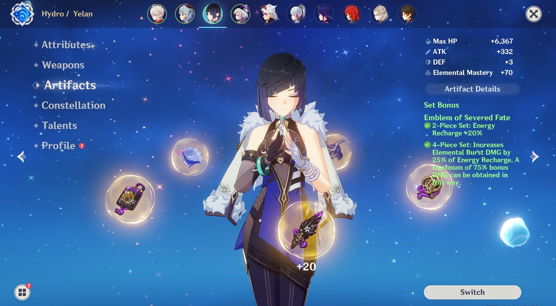 - Sub-stats – You’ll want crit damage, HP%, and energy recharge on your artifact rolls. Extra crit rate might also be necessary, though you should consider Yelan’s ascension.