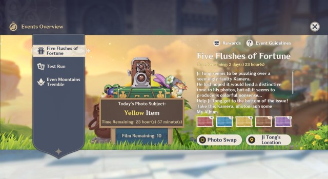Day 5 of Genshin Impact‘s Five Flushes of Fortune event has players taking pics of yellow items with the Kurious Kamera. Here’s our guide to help you out.