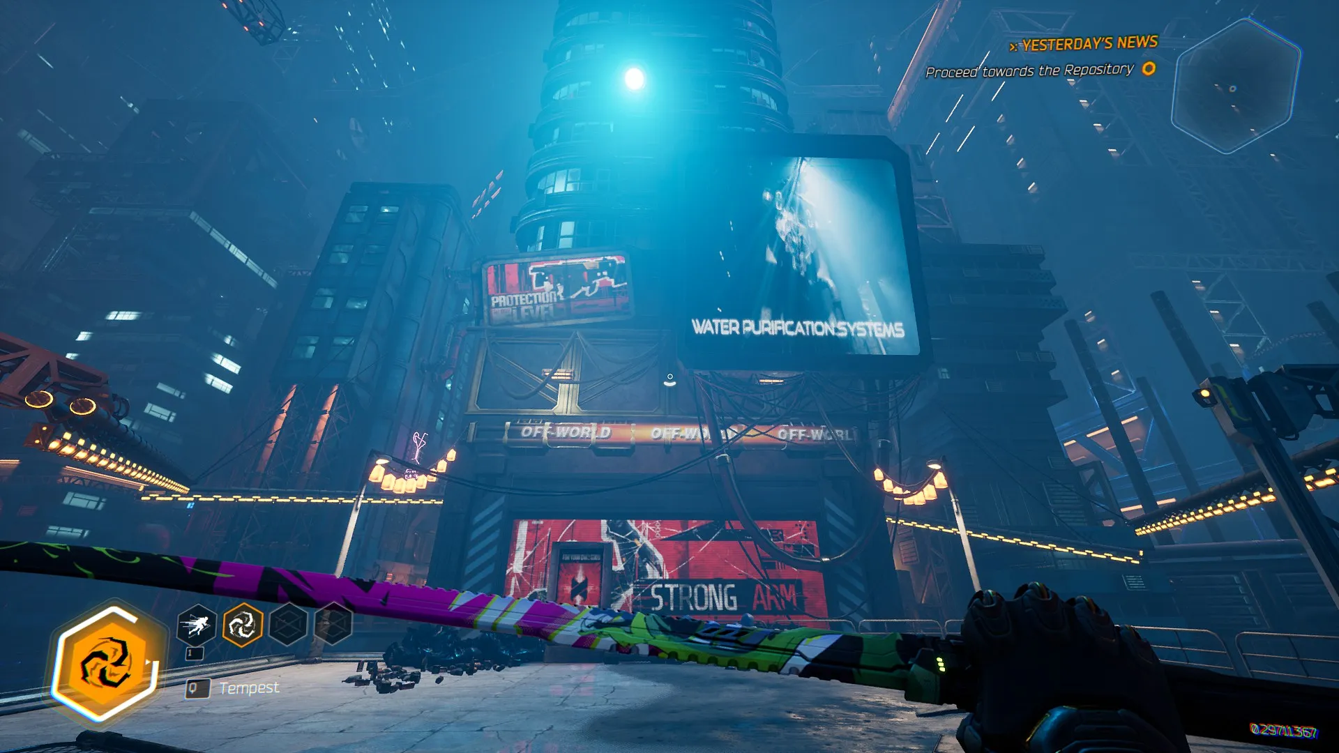 The basics of moving Jack are mostly standard in Ghostrunner. You move around in first-person, and you can wall-run, grapple at blue grappling points, and dash forward or to the side. Wall-running is one of the most important aspects to get a feel for once you begin. As long as you touch a flat wall while moving forward, you’ll start wall-running automatically. You’ll often jump back and forth between walls as well. One thing that’s important is that you’re going to want to change direction before jumping.