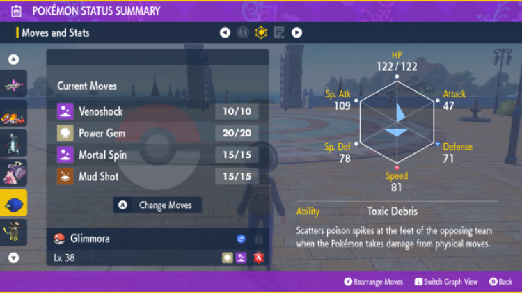 Next, let’s talk about Glimmora’s stats in Pokémon Scarlet and Violet. It has a base stat total of 525, which is excellent for a non-pseudo or legendary Pokémon, and its highest stat by far is Special Attack.