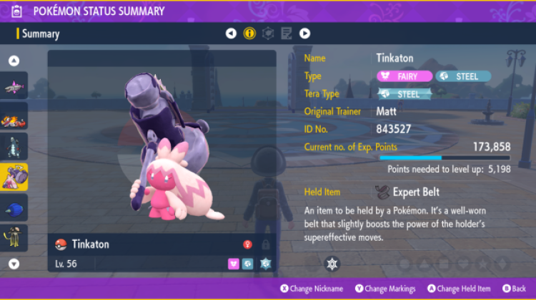 The final counter I’d like to talk about here is another unique Pokémon with a unique typing: Tinkaton. Tinkaton is fairy/steel type and should be weak to poison thanks to its fairy type, but its additional steel type makes it immune to the poison status effect and poison-type moves. While its base attack stats aren’t great, Tinkaton learns a signature move called Gigaton Hammer. Gigaton Hammer is steel type, 100% accurate, and has 160 base power. Exceptionally few Glimmoras should be able to survive a Gigaton Hammer, making Tinkaton one of the best Glimmora counters in Pokémon Scarlet and Violet.