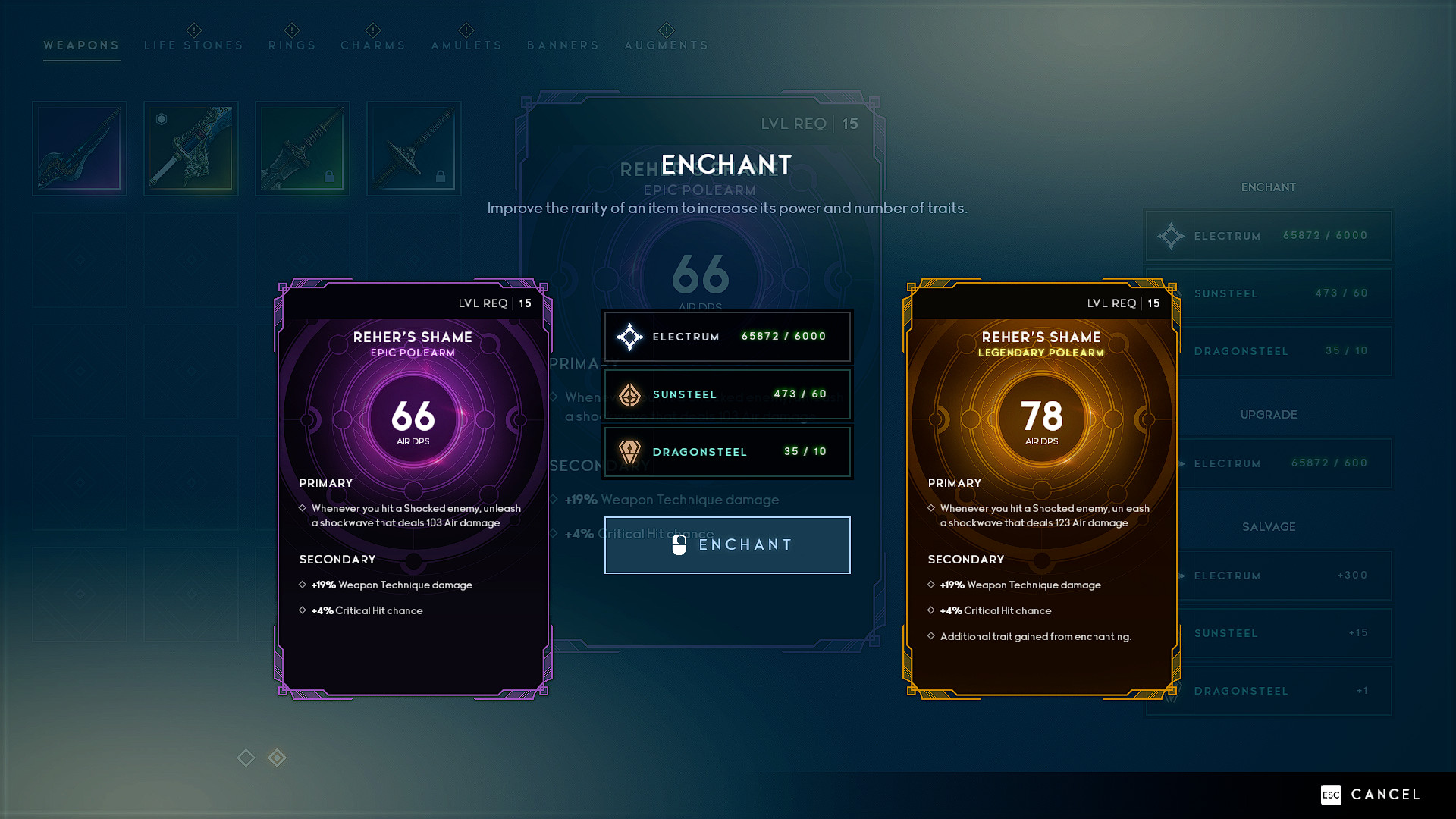 As you’d expect, each upgrade level in Godfall has higher and higher resource requirements. But these still won’t be quite as expensive as enchanting your gear. Enchanting increases the rarity of a piece of gear and improves the DPS more than simply upgrading will do. But it also adds additional boons to a piece of equipment. A green rarity item, for instance, only has a single boon, while a blue one has two. If you have a favorite weapon type and haven’t gotten any good drops lately, it can be worth enchanting a better one. But it’s quite pricey. Doing so costs thousands of electrum and a hefty amount of Dragonsteel. For instance, upgrading from a purple weapon to a gold one will take ten Dragonsteel, which would require you to salvage four other epic items to attain.