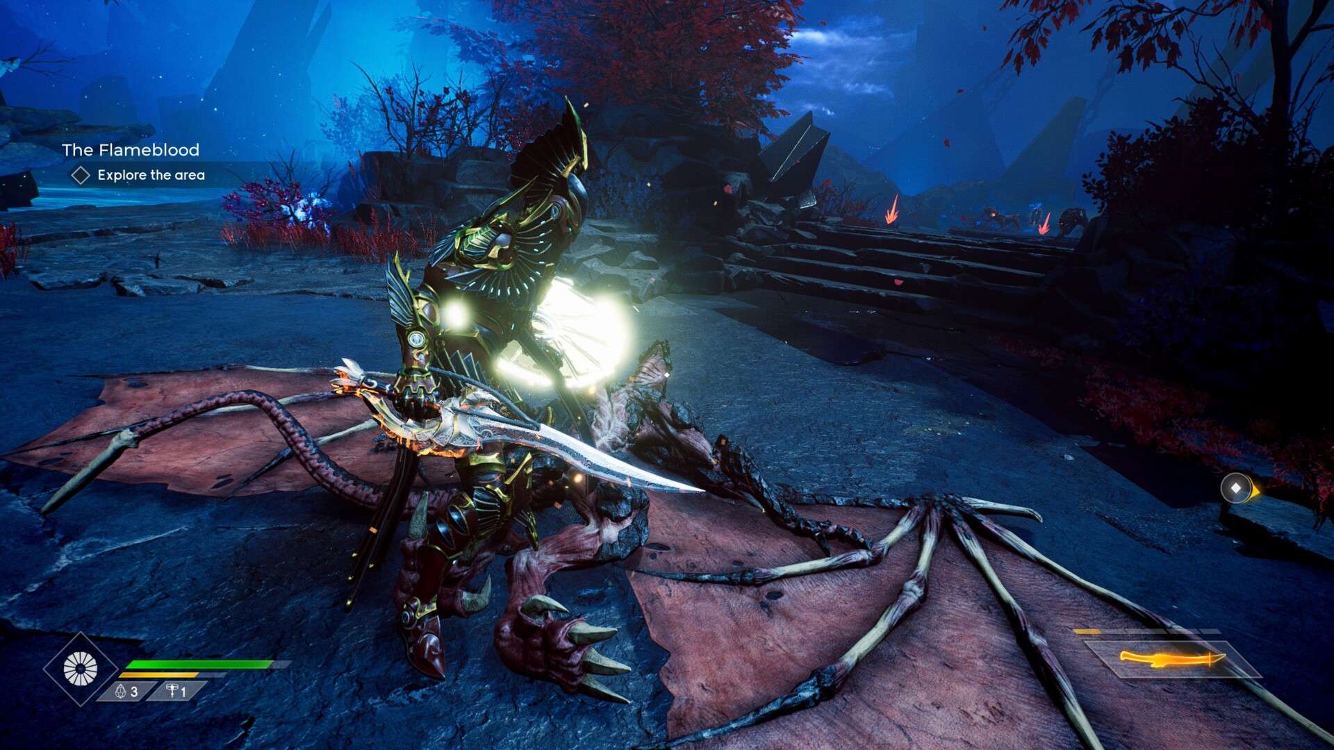 Godfall wasn’t particularly a story-driven game to begin with, and Fire & Darkness isn’t much different. Moirox is a your standard villain, and the narrative here isn’t going to do much for some people. The Fire Realm itself acts as a fourth Realm, as the base game contained Earth, Wind, and Water. Unlike those, though, I find the Fire Realm to be much less visually interesting. The place is mostly comprised of dark blue stonework with splashes of red, and it doesn’t take long to get visually monotonous. Structurally, it’s very much like the game’s other Realms, though, and you’ll find materials, lore codexes, and enemies all over.
