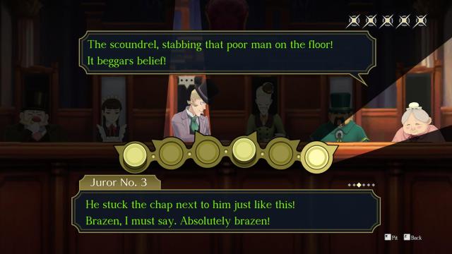 In the case that introduces this mechanic, it’s (again) mostly a tutorial thing. I’m genuinely curious as to how this will evolve in later cases and in the included sequel. Pressing witnesses is often enough to make jurors cast their vote towards the dreaded guilty verdict, and I wouldn’t be surprised if we end up with a few situations in which you’ll have to be very careful about which statements to press.