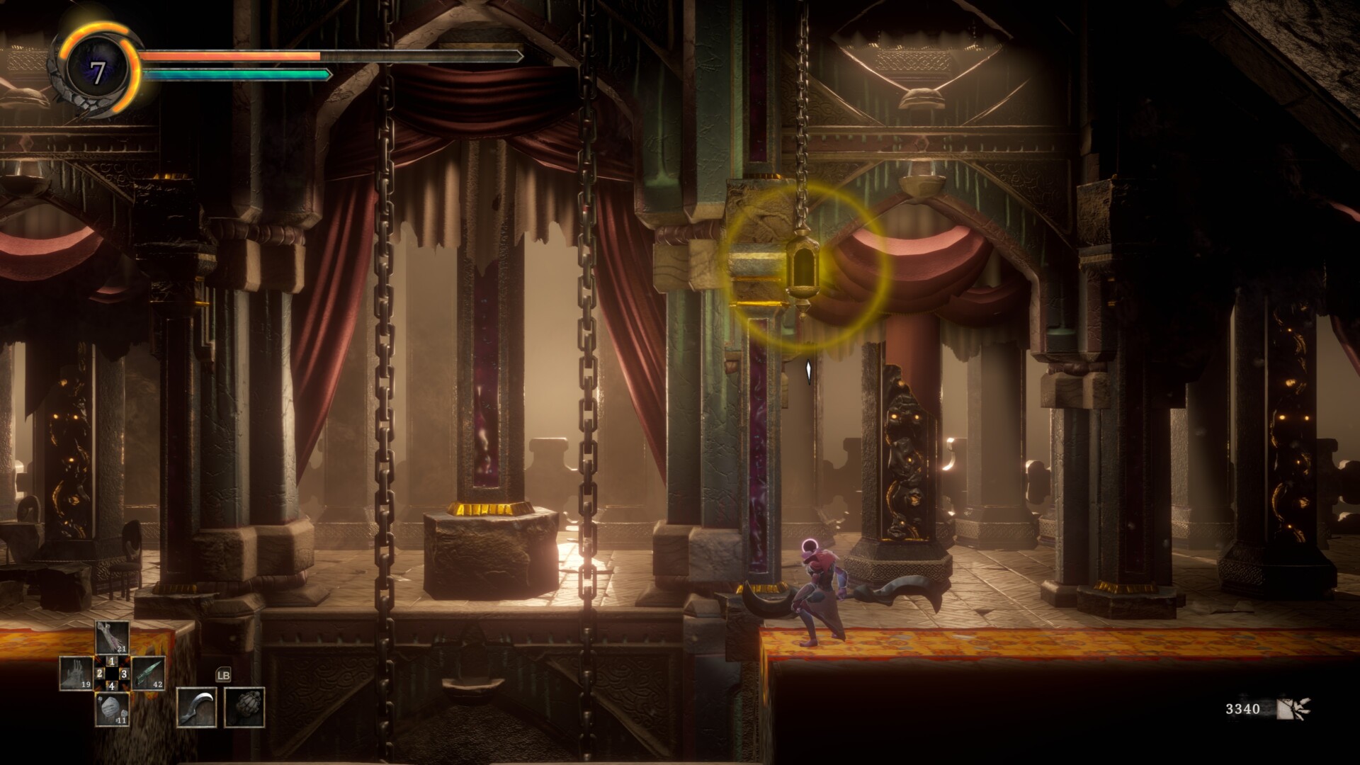 Once the coast is clear, ride the platform until you reach the third floor. Let’s talk about that section in the next part of our Grime Carven Palace guide.