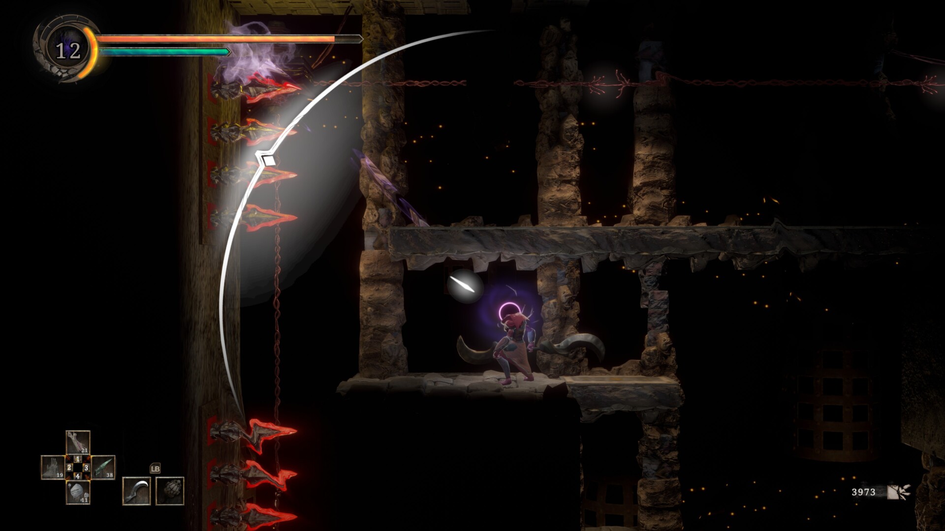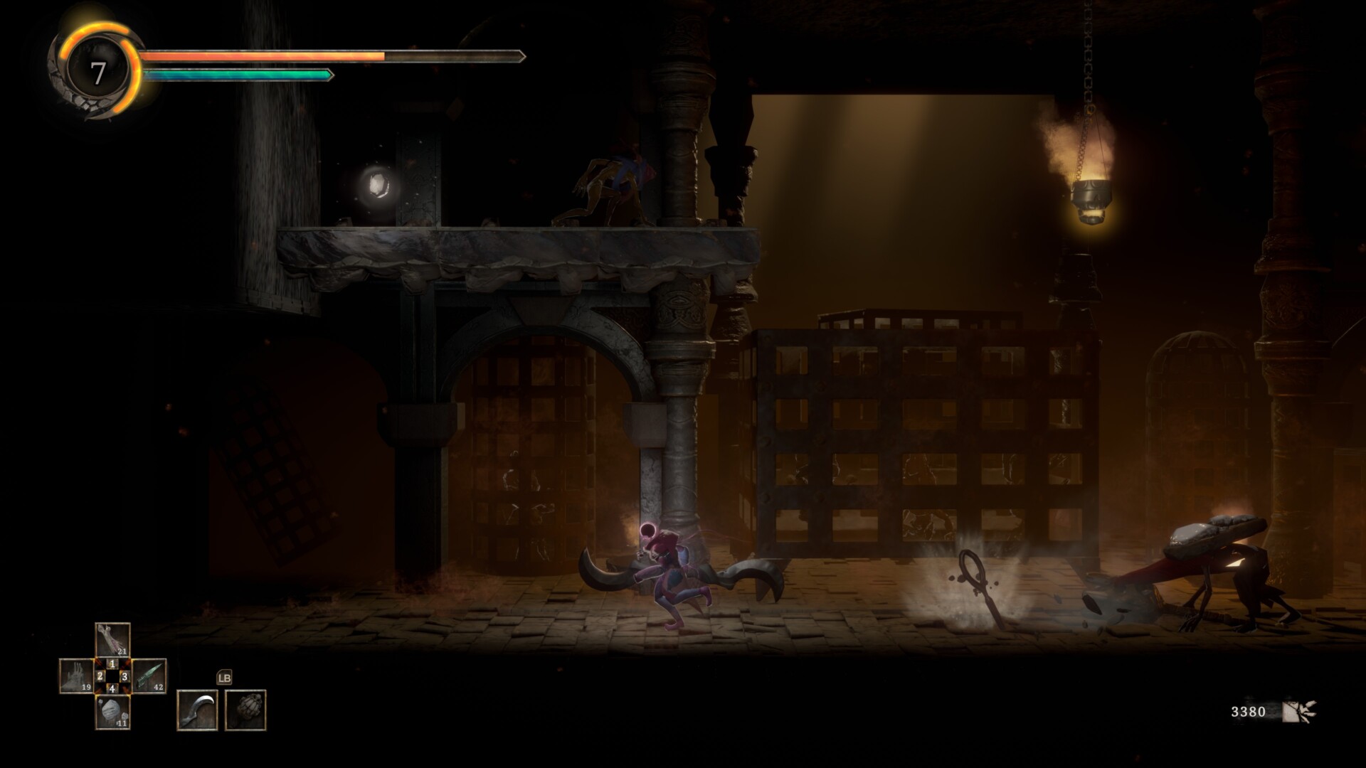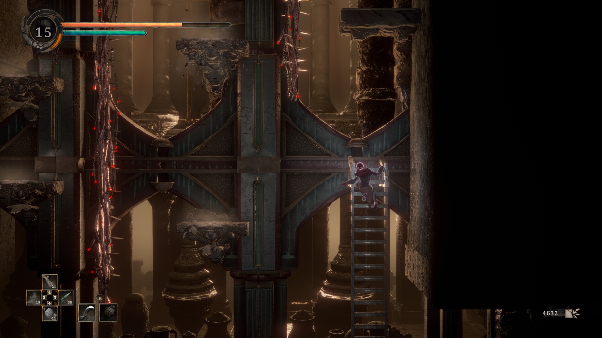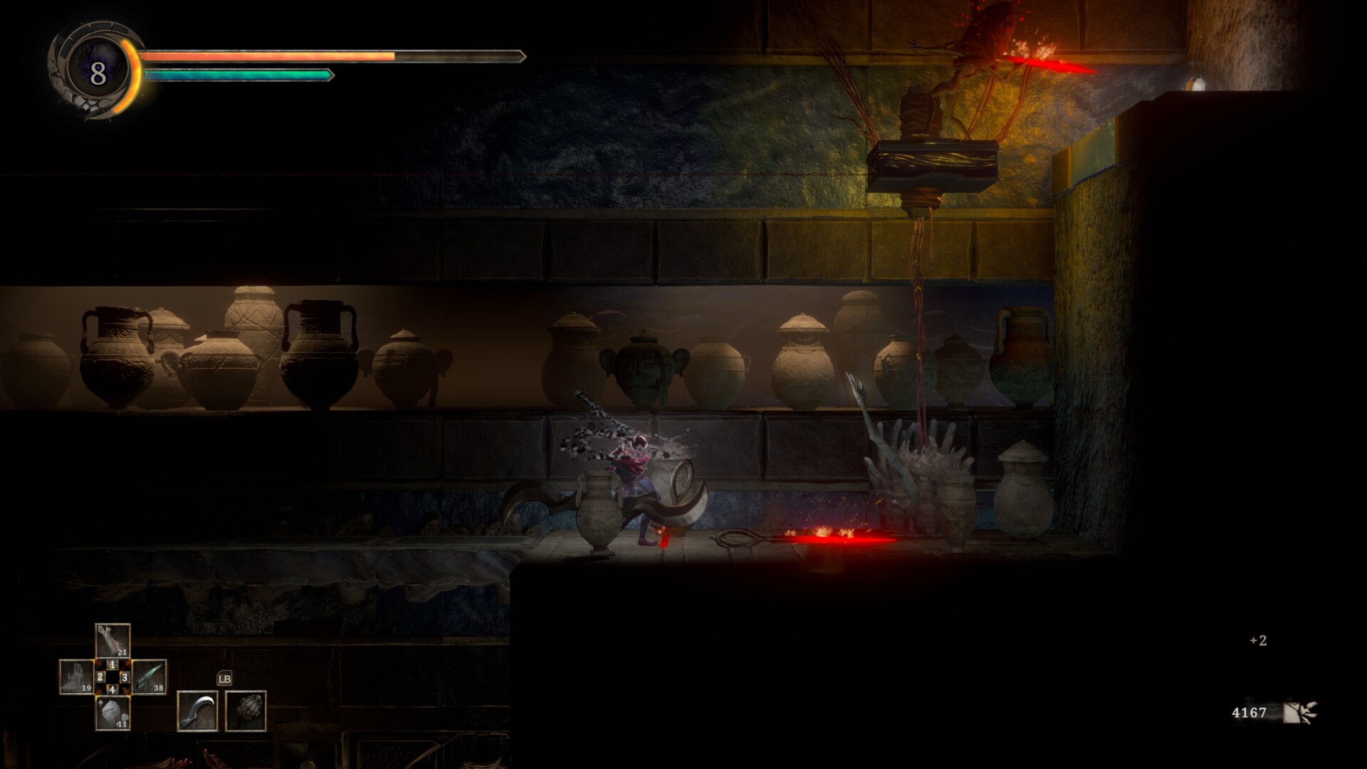 Eventually, you’ll encounter another platforming puzzle at the top of the chamber. There’s a sword-throwing Servant on the platform, but you can pull it to make the enemy fall. If you can climb on the platform and push it back to the corner, you’ll find an Unformed Torso (1,500 mass).