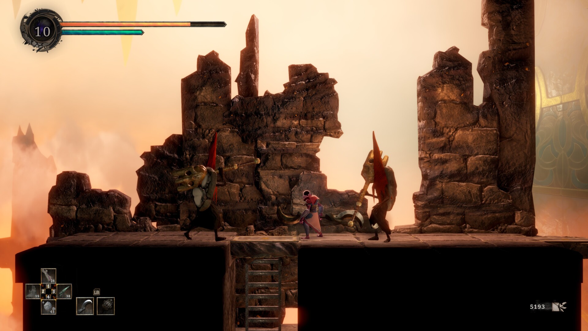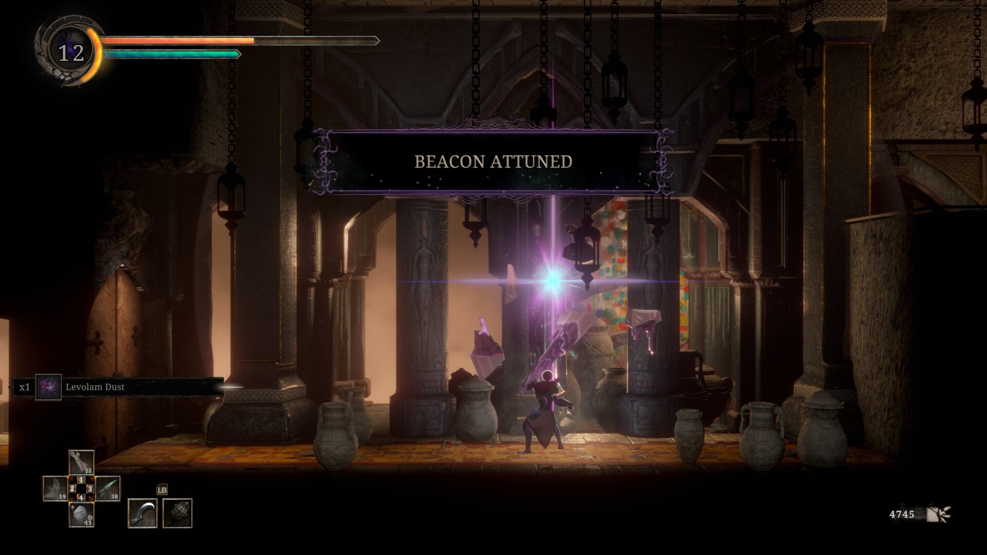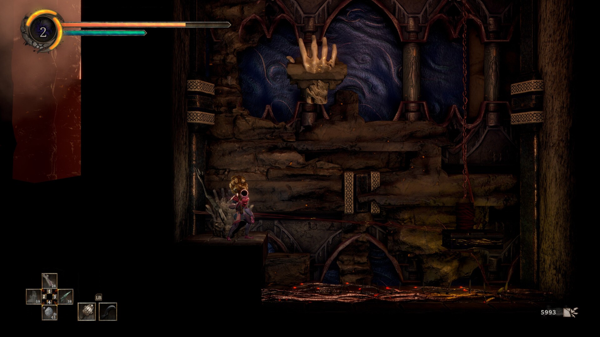 You’re now on the third floor of the Carven Palace zone in Grime. To the left, you’ll see a ladder with a locked door at the top. There’s also a chamber with 3x Pillar Fragment, an item you can’t reach, and a few mobs that are asleep. You can kill the Disciple here you get a Hunt Point, though.