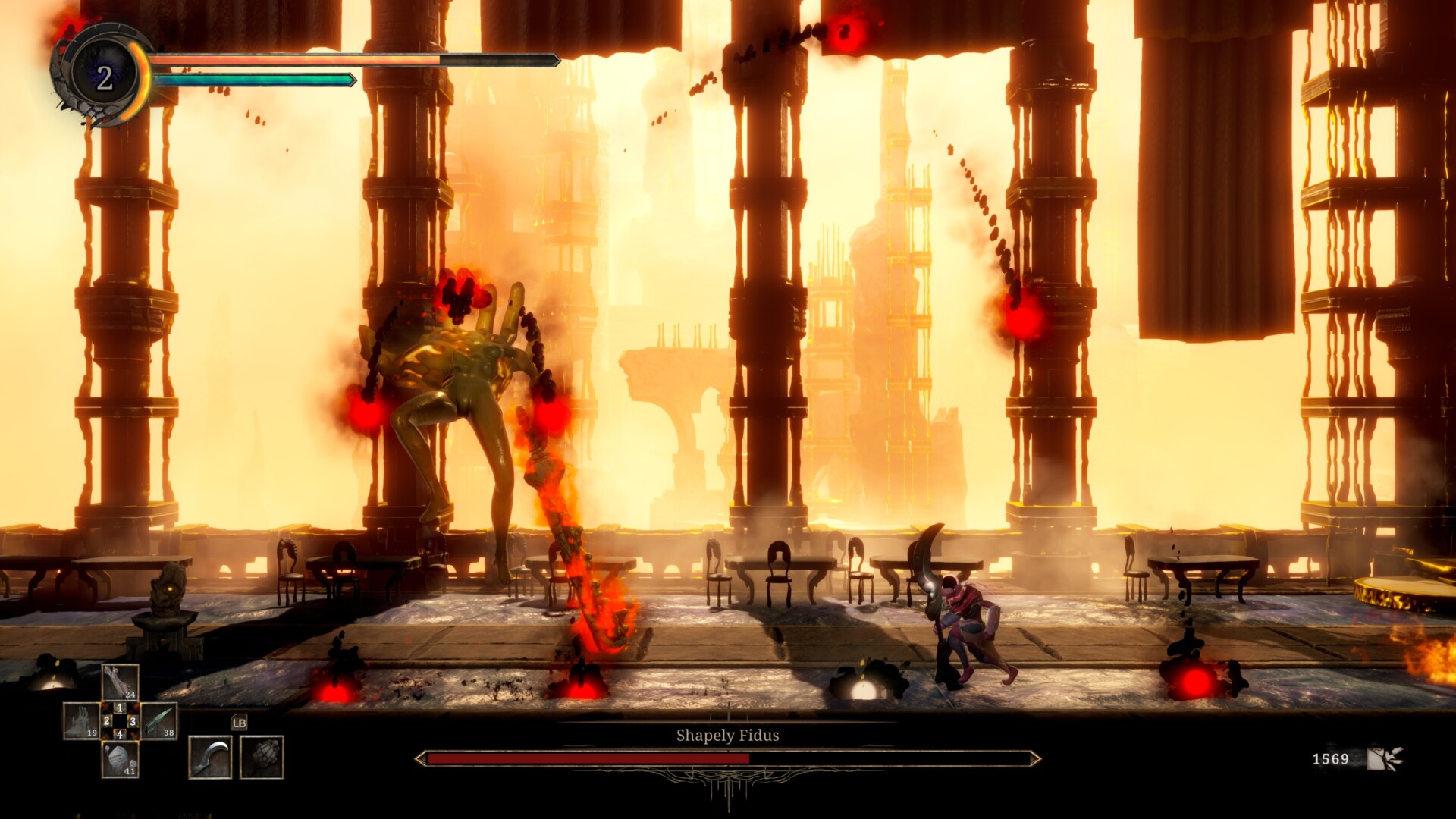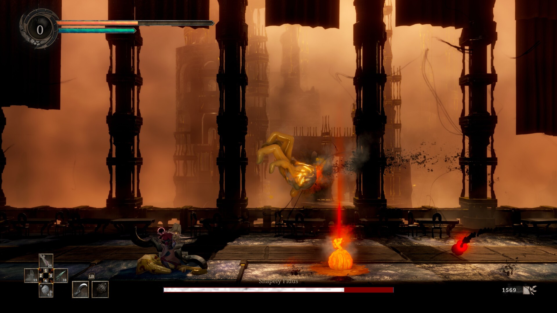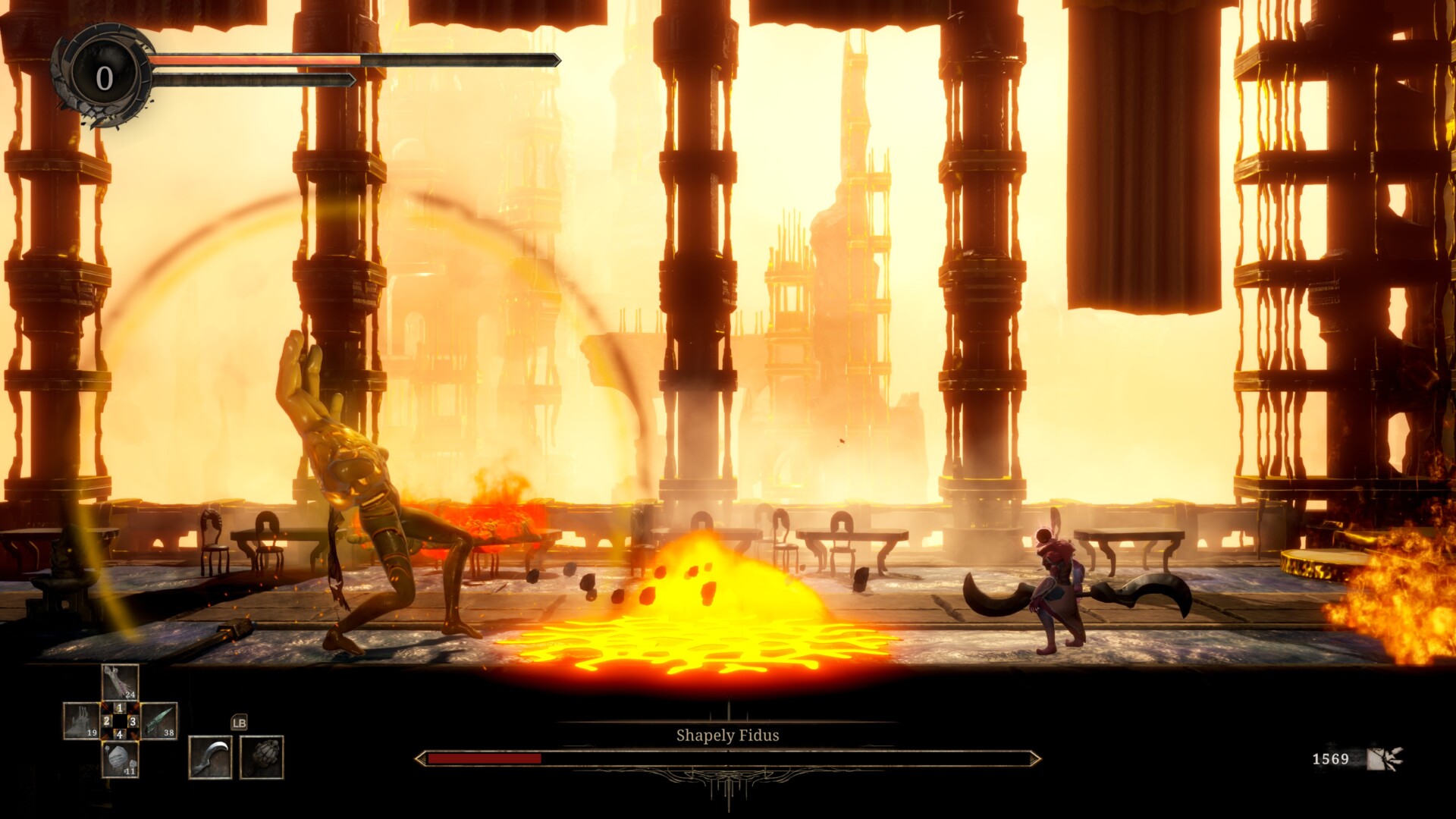 Shapely Fidus, a boss with a hand for its head and a woman’s body, will chide you before causing flames to erupt. Make sure you’re ready for this battle because the boss has several attacks that can’t be parried or reflected.