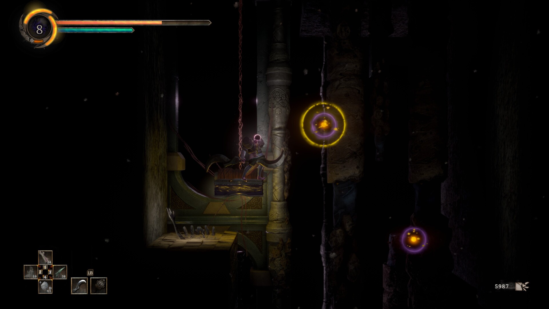 If you look to the right, you’ll notice several shadow orbs. Go ahead and grapple to reach several items (i.e., sands and mass). Keep going through using your air dashes and grapples until you grab everything.