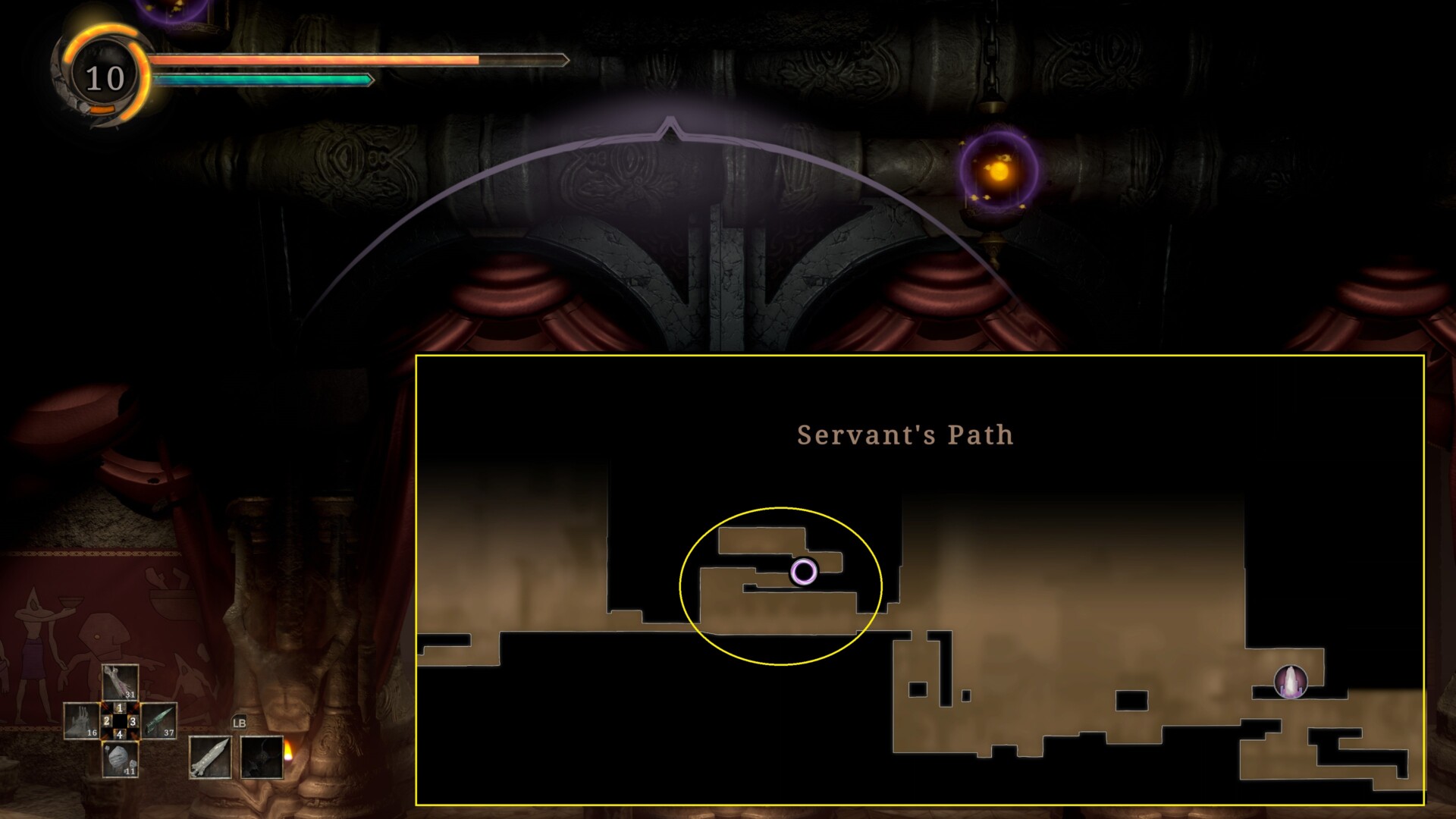 Do you remember that area I mentioned earlier? The one with the two Servant mobs? There are ledges on the ceiling that lead to a hidden passageway.