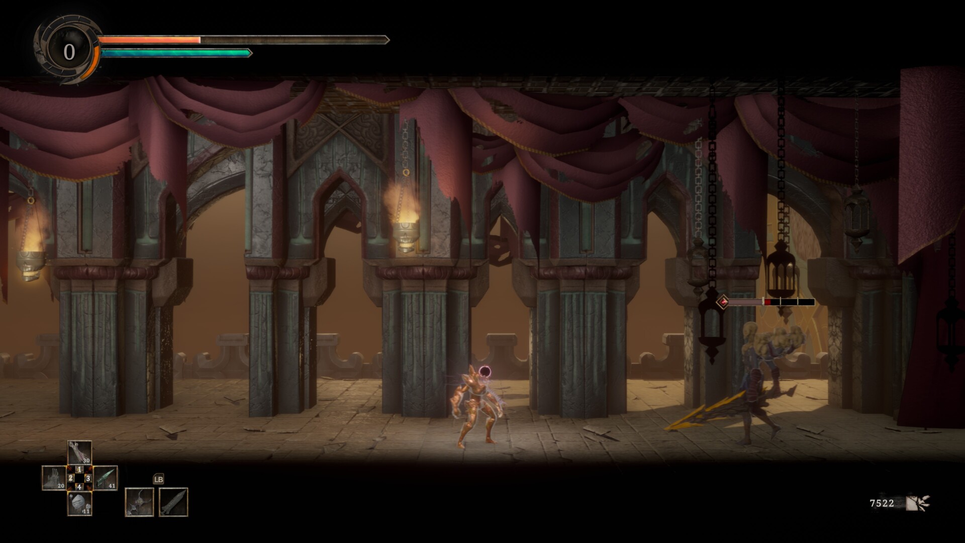 You’ll enter a large chamber that looks like a ballroom. You’ll notice lots of ledges and a few shadow orbs that you can use for grappling.