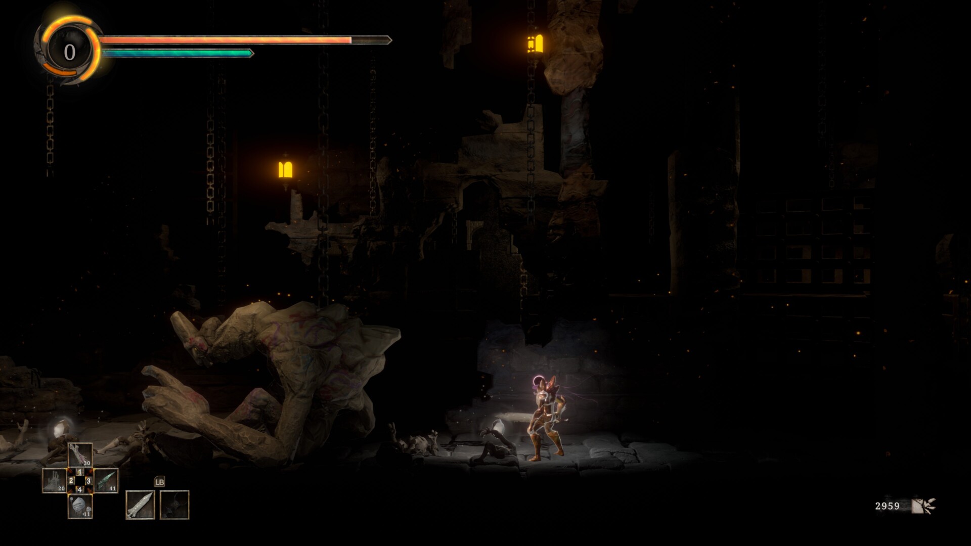 The miniboss has a fairly slow melee attack as well, which means you can parry/absorb to deal damage and cause the Cluster Bombs to despawn. When you kill it, you’ll receive another upgrade to your Breath (healing) capacity.