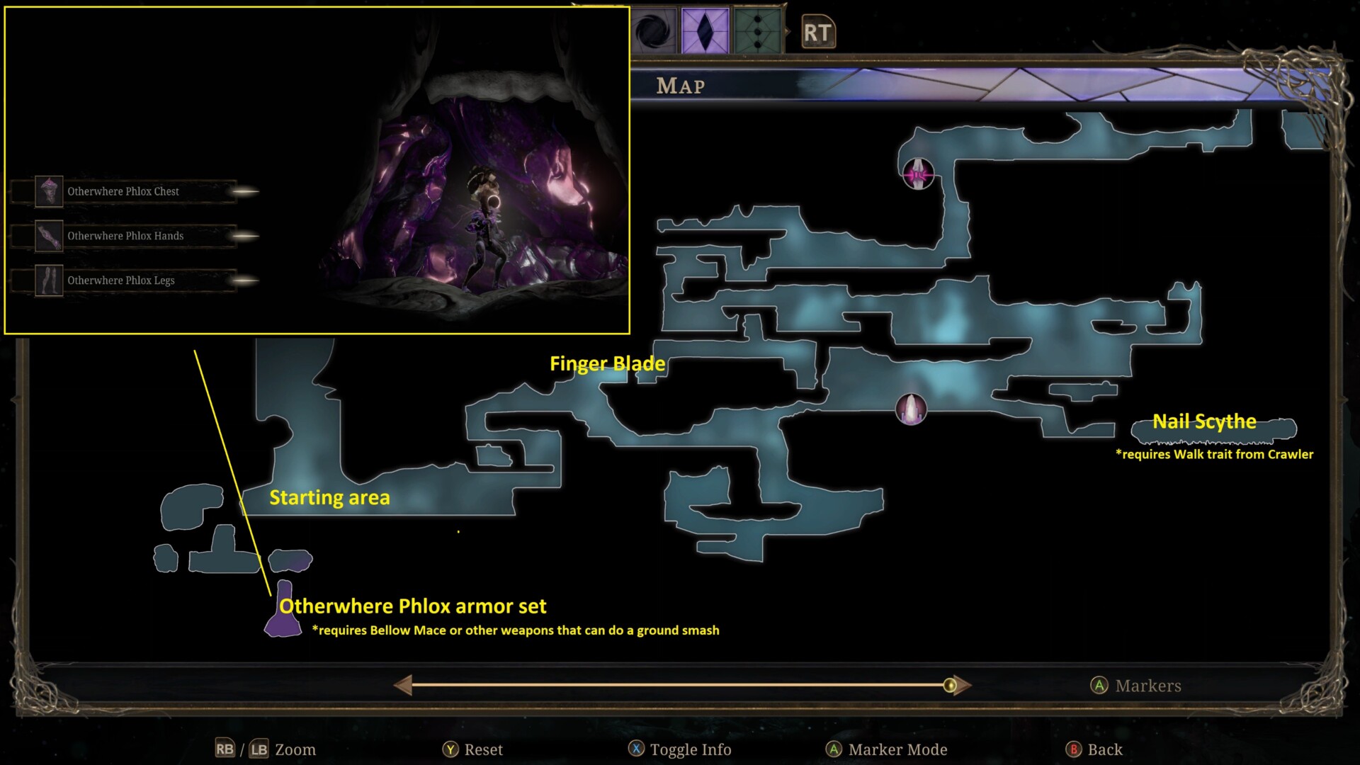 The Otherwhere Phlox armor set is found near the starting area in Grime. Go to the left of the starting point and break open the walls until you reach the bottom level.