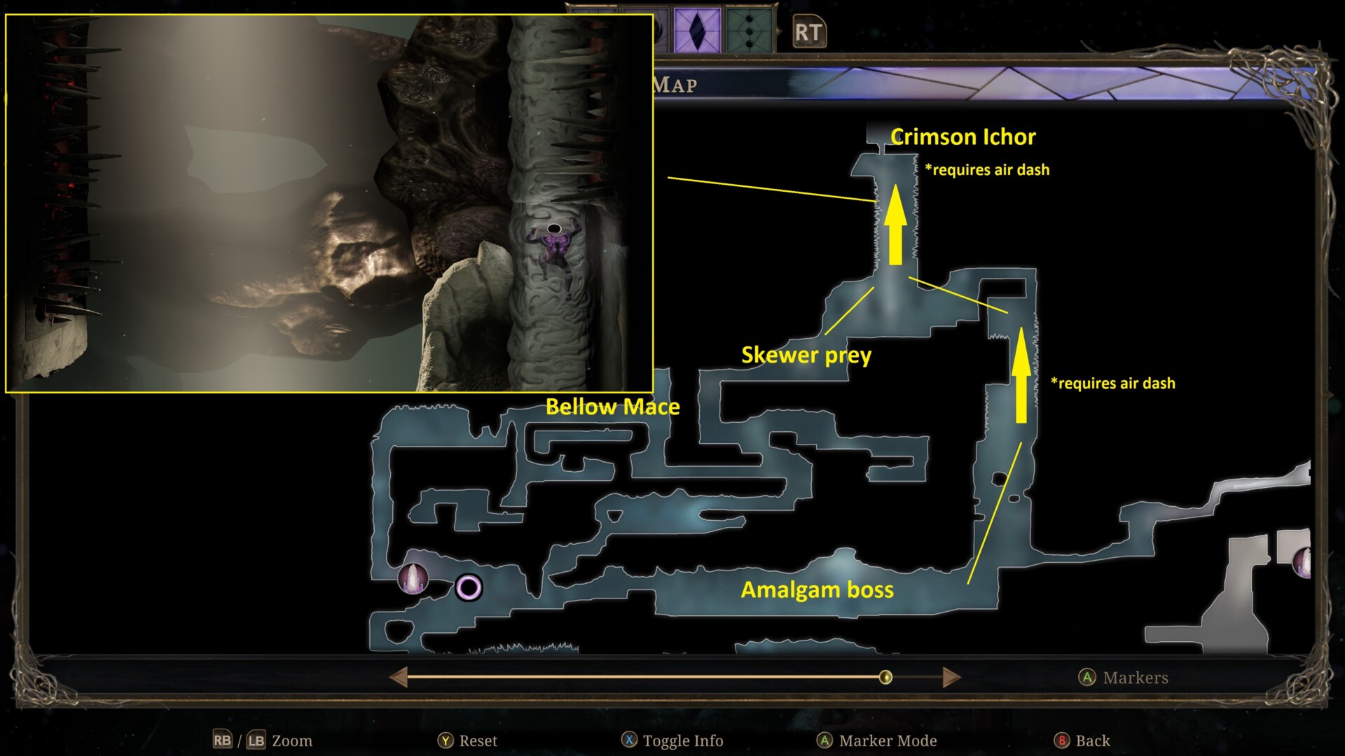 As for the Crimson Ichor (a consumable that gives an extra Hunt Point), it’s found past the Amalgam boss fight area. You’ll air dash as you climb to avoid the spike traps. There’s also a Skewer mob down below that can be killed for an extra Hunt Point.