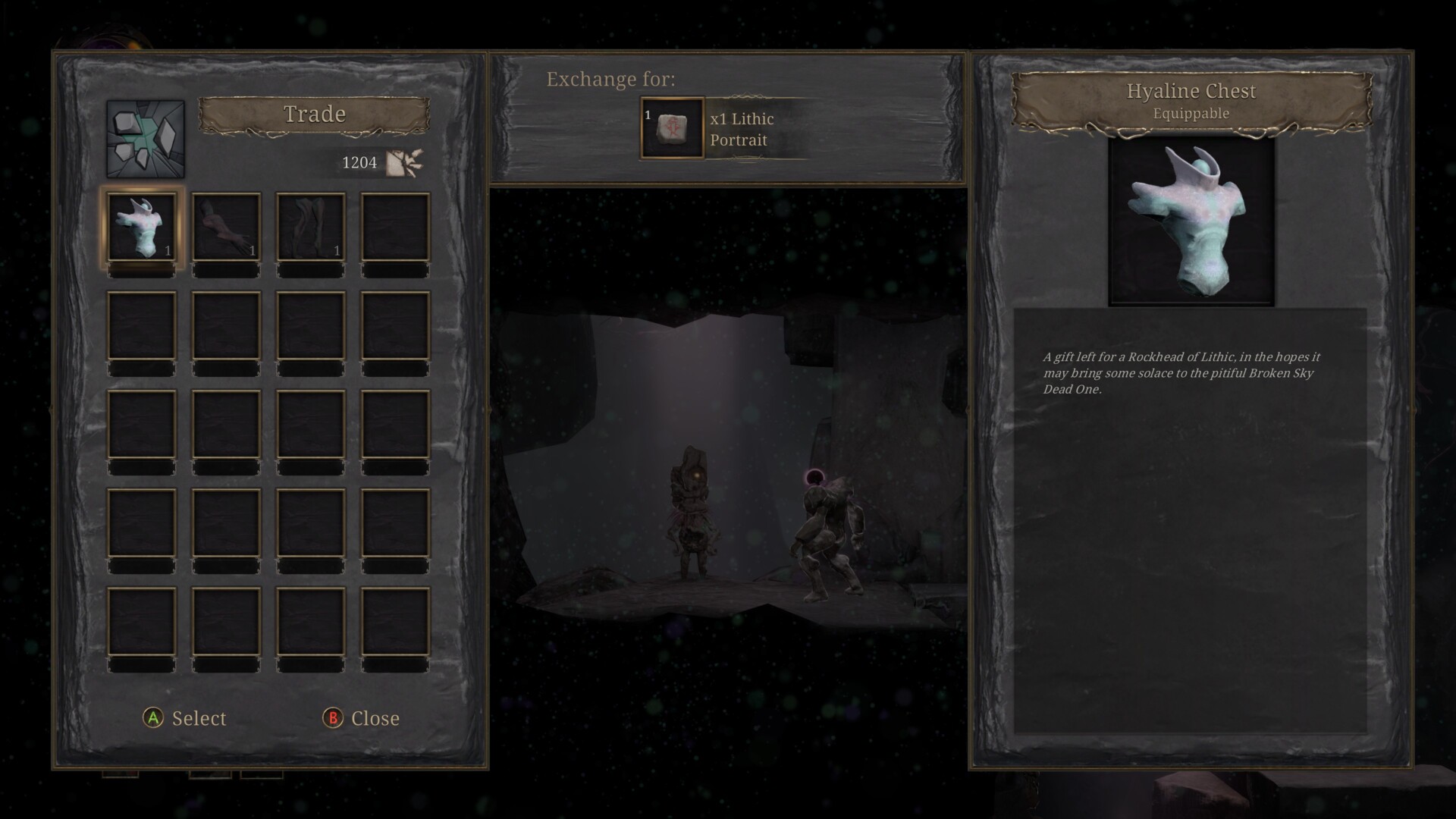The first one is the Lithic armor vendor (found to the left of the Lithic – Lower save point). The NPC gives you Hyaline armor pieces in exchange for the Lithic Portrait, Lithic Effigy, and Lithic Poem.
