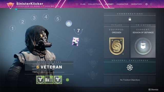 Guardian Ranks can be found in the menu underneath the new ‘Journey ‘ tab. There’s also a shortcut to this menu when you’re in orbit. Long-time Destiny 2 players will notice that this tab has replaced the old ‘Triumphs’ menu.