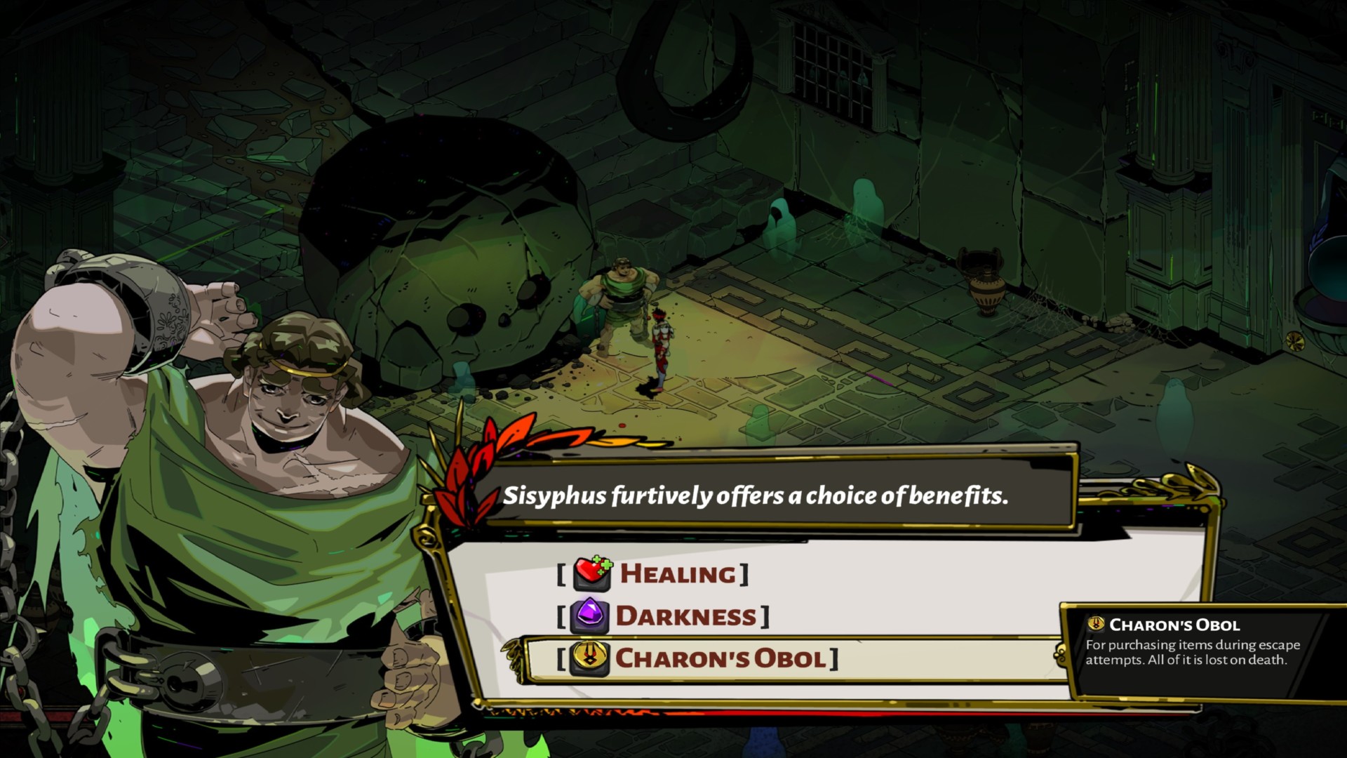 You can also gift Sisyphus some nectar anytime you meet him. Eventually, you’ll be able to give a nectar gift to his, uh, boulder companion, Bouldy. Doing so will provide Zagreus with a minor random buff (“Heart of Stone”) to one of his stats such as attack damage, casting skill damage, defense, speed, and others.
