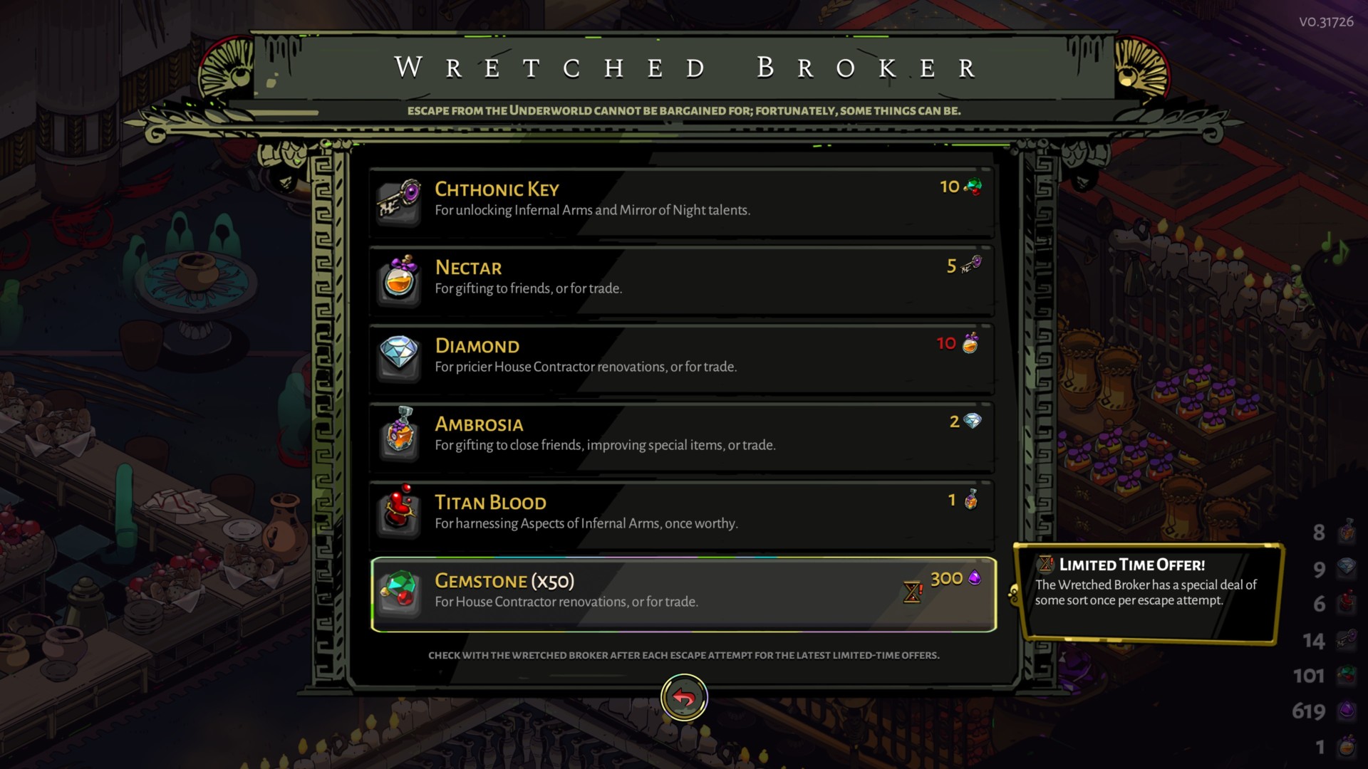 As you can clearly see, the prices can be a little too steep at times. It’s often better to just farm for the items you want unless you’re really in need of a specific resource. You can also check back with the Wretched Broker after each escape attempt because he’ll have different limited-time offers (seen in the image below).