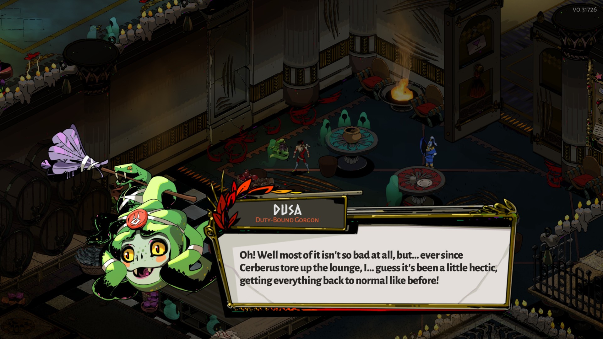 - The Lounge – This doorway is just opposite of Zagreus’ bedroom. It won’t be available until you’ve done a few runs in Hades‘ dungeons (success won’t matter). Once available, you’ll find the chef (you can give the fella any fish you’ve caught in the wild), the Wretched Broker (who can process resource/artifact trades), and Dusa, the house maid — Maid Dusa = Medusa, get it?