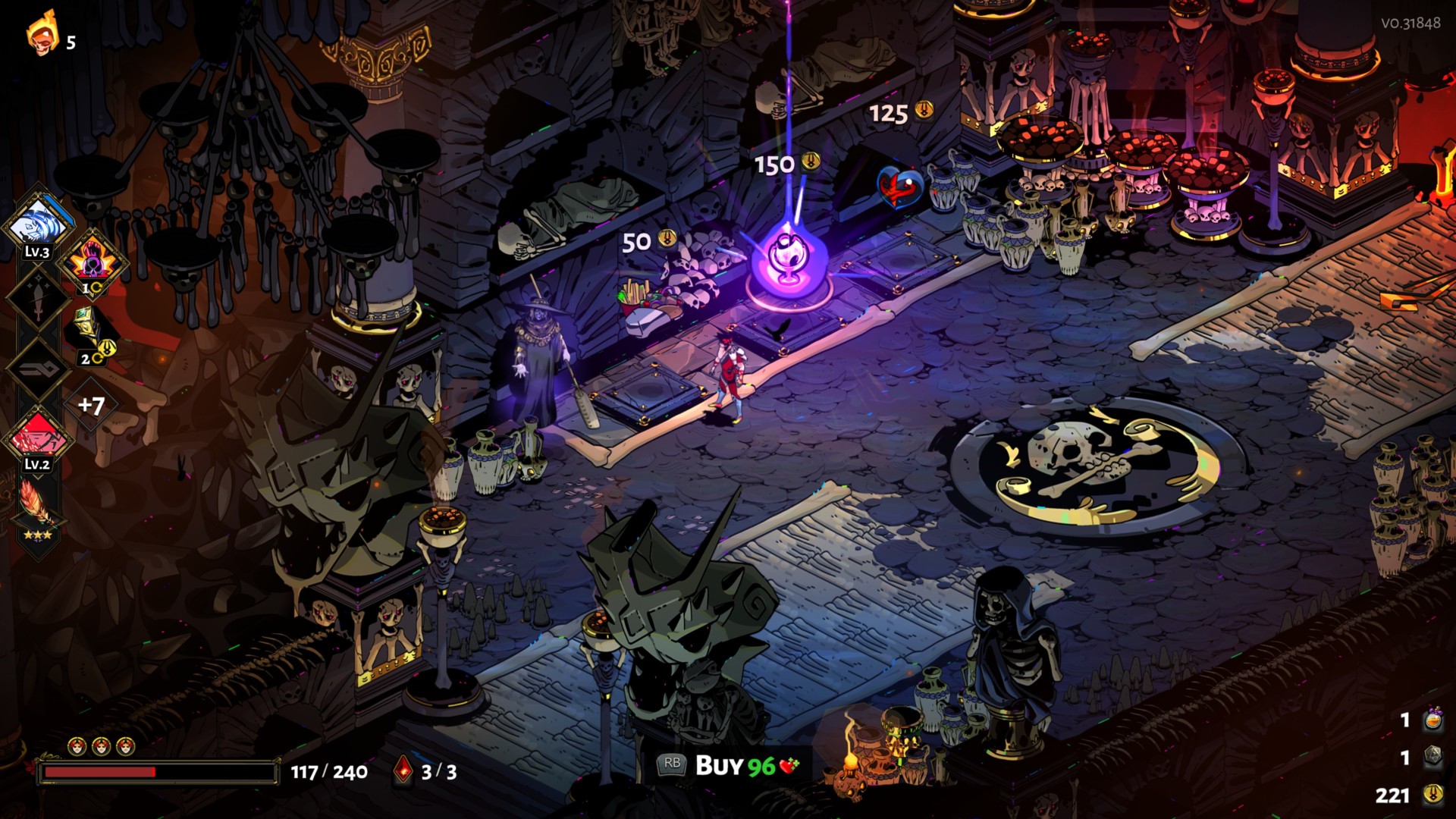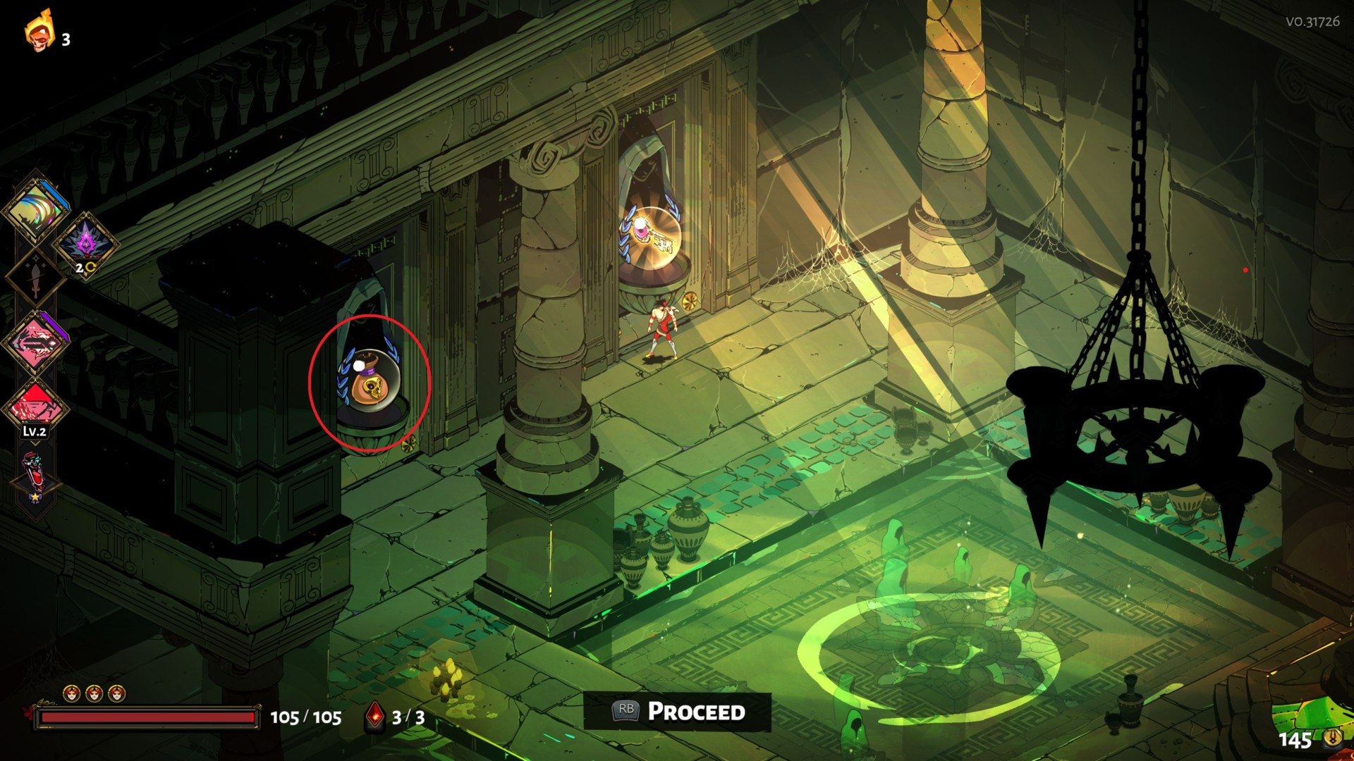 Charon’s shop is quite different in the Temple of Styx region. Rather than randomly finding him in certain chambers, he’s found in the main room of the area and he sells six items.