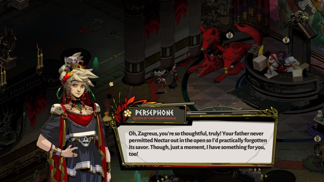 Note: You’ll need to speak with Persephone 10 times (this includes your first meeting with her). It’s hard to keep track of all your attempts, so just make a mental note of the dialogue. For instance, once Persephone tells Zagreus to just go home, that’s the eighth time that they’ve spoken.