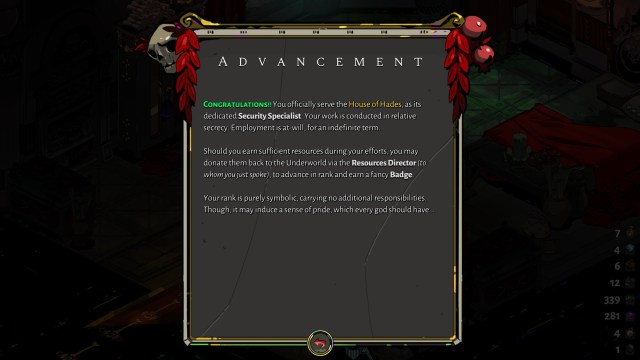 - Resource Director and badge ranks – As you continue to progress and do more clears, Hades will eventually tell you about the Resource Director. The shade is found inside Hades’ chambers (the room near Achilles and the trophies). Giving the Resource Director 10 Chthonic Keys and 1,000 Darkness Crystals will net you the Alpha Warden badge. Badges are just cosmetic changes you’ll see next to Zagreus’ HP bar.
