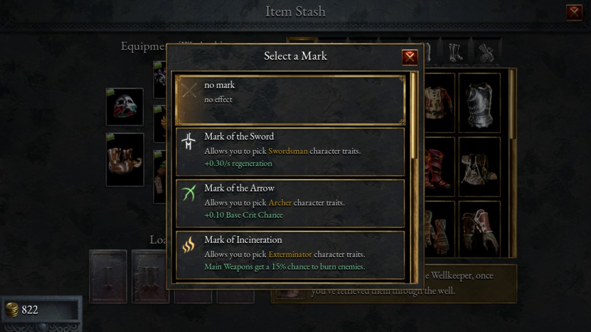 Once you’ve unlocked some Marks, you can start to use them in your runs. All nine Marks give you two things: a passive buff, and access to a new suite of Traits. For example, the Mark of the Sword, the Mark associated with the Swordsman, grants you +0.30/s health regeneration, as well as access to Swordsman character Traits. The latter point can be confusing, so to clarify, it means you’ll be able to choose two additional options for the Weapon Proficiency, Proficient Stance, and Dedication Traits.