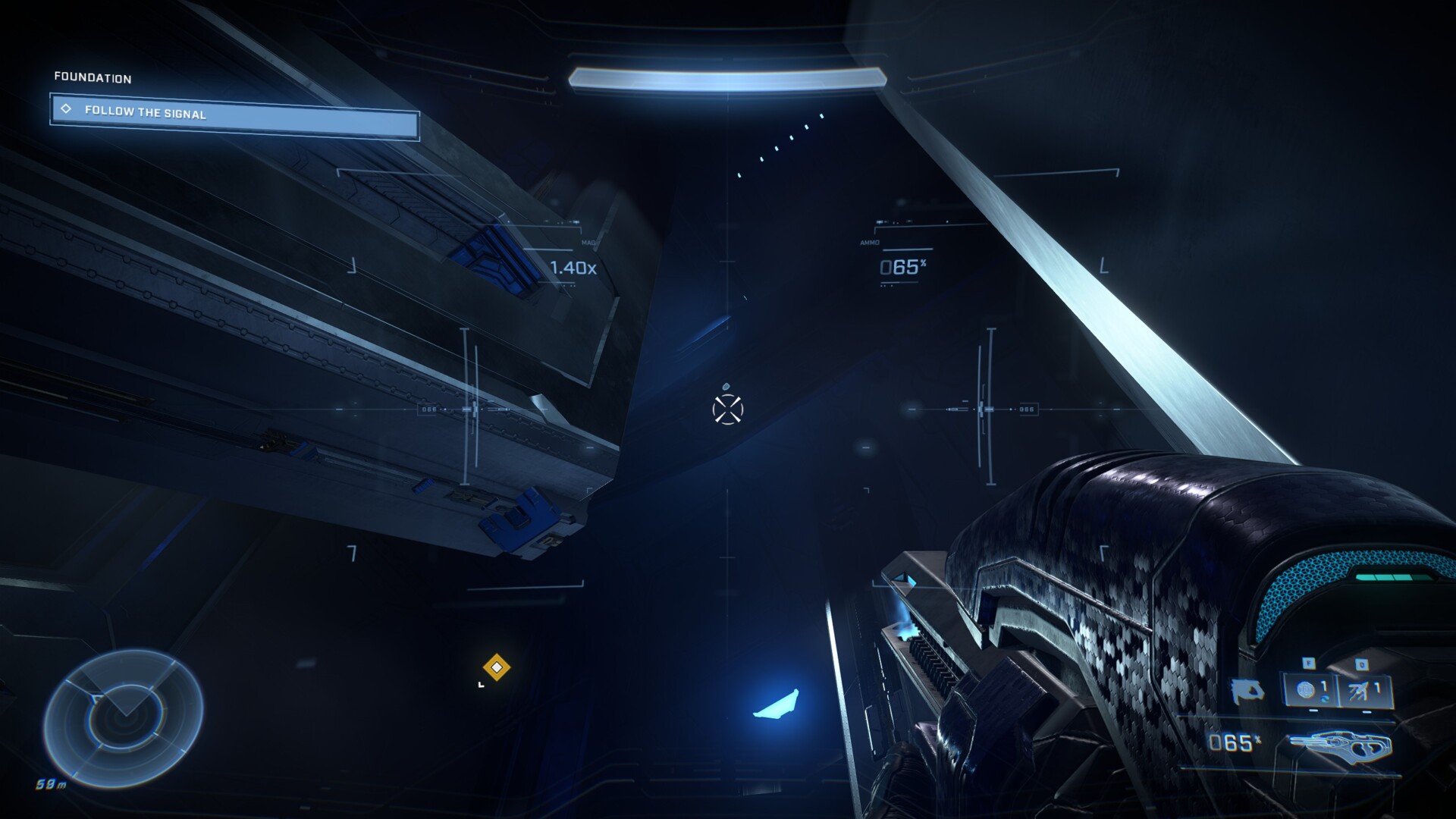 In the mission, The Command Spire, progress until you find yourself in a room with floating ‘columns’ moving through a wide all of sorts. Follow the marker on your HUD until the columns stop and turn to the right. There are some Banished forces in the room, so wipe them out before proceeding. Next, grapple onto a column and get on top. Look up and there will be a large hole in the ceiling.