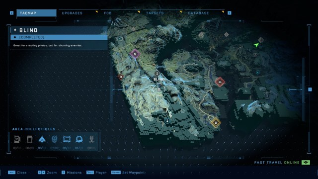 You’ll find the Blind Skull on the southwestern most part of the map, and south of The Tower. Zoom into the tacmap, and you’ll see two large mountains with a crevasse between. Just under a small bit of land between the two is your quarry.