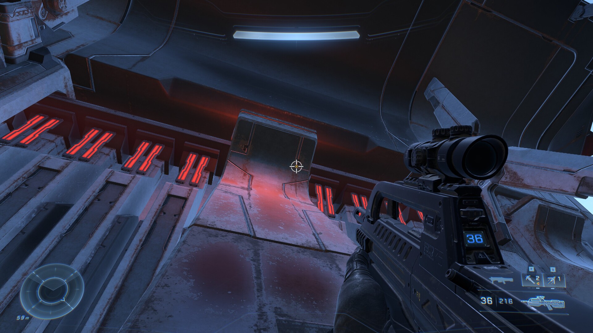 Following your second elevator ride, you’ll come across an open room with a narrow platform on the left side. Grunts and Jackals are waiting for you hear, so it’s best to take them out. Here’s what the area looks like, with a dead Grunt. Because I mean business.