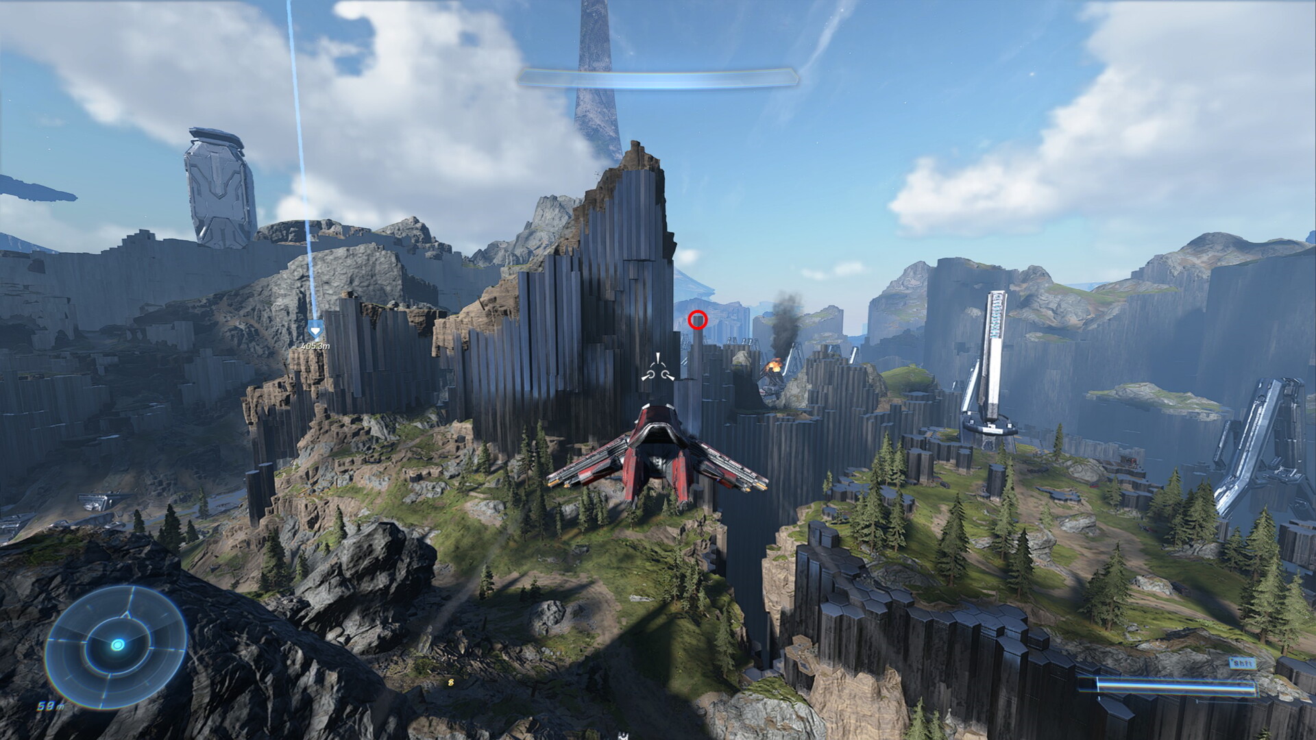 The Thunderstorm hidden Skull location is next to the small island that you end up on during the Halo Infinite campaign. You may remember this as when you first meet up against the Spartan Hunters. They weren’t tough. And neither is finding this Skull, so long as you have either a flying craft or upgraded Grappleshot. The Skull is on the southeastern part of the island on the outside. Don’t try searching for it from within the island. Approach from the south, heading north. The Skull is on top of a large pillar. I’ve circled it below: